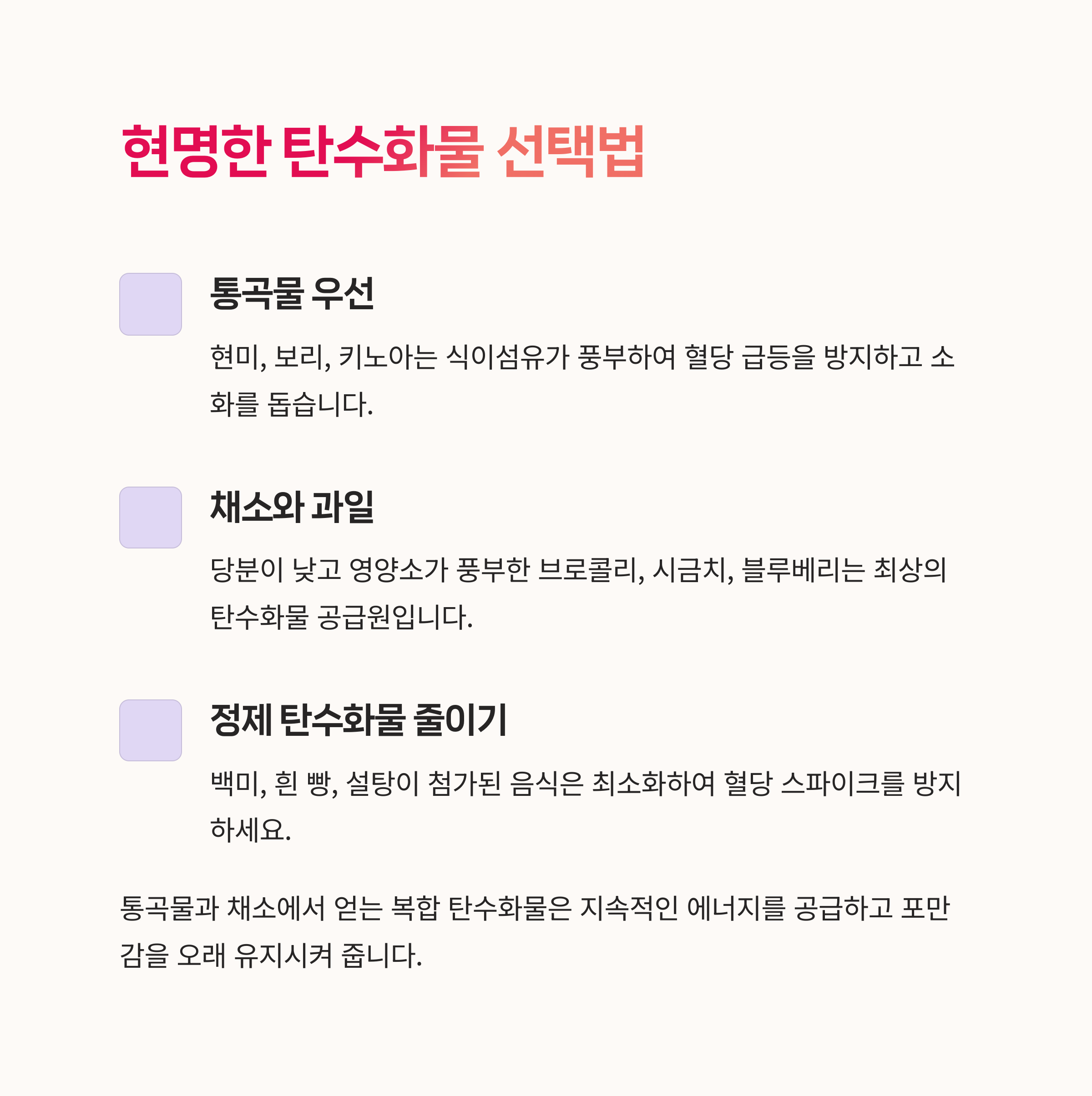 반면, 탄수화물은 반드시 통곡물, 채소와 같은 비정제 형태로 섭취해야 합니다.