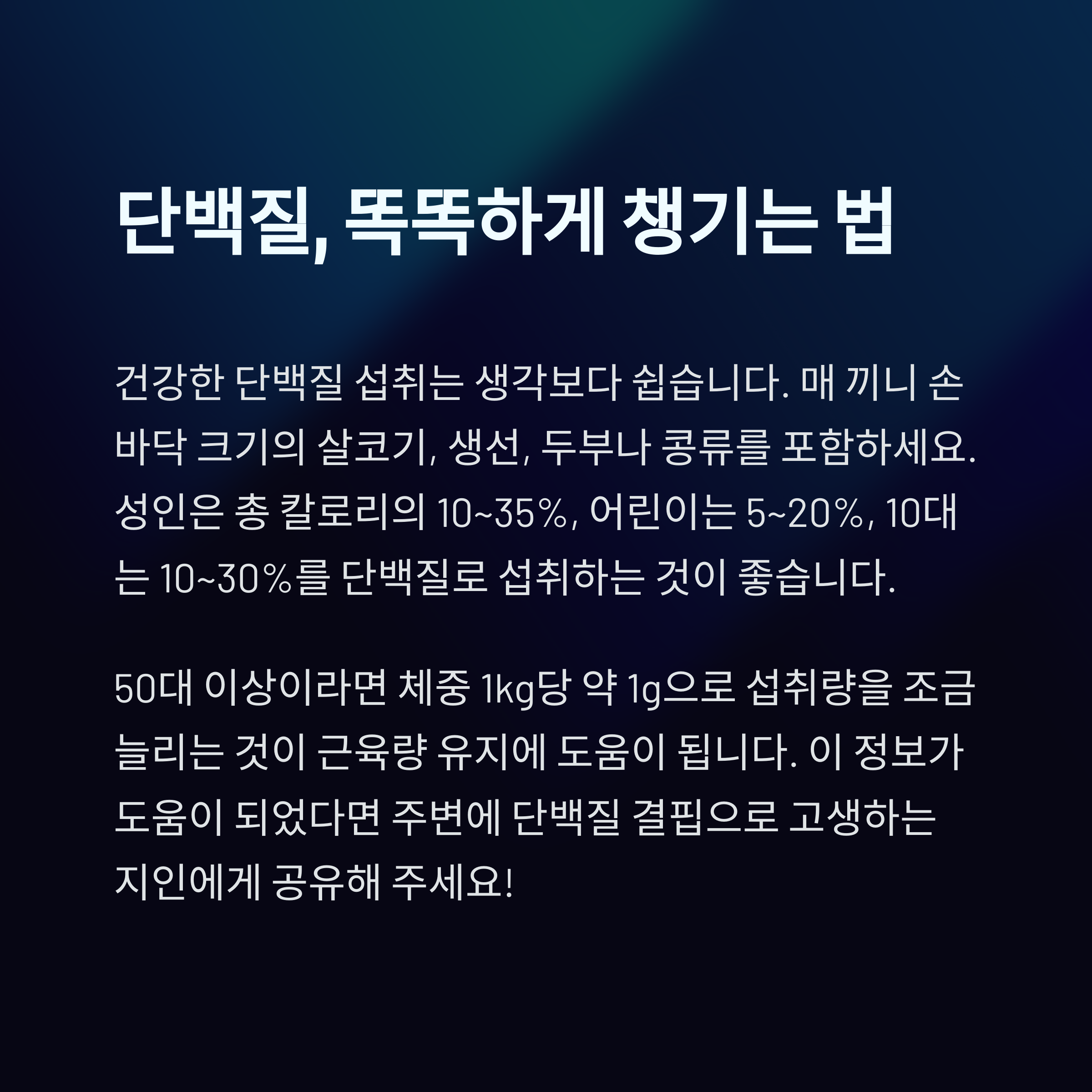 따라서 개인의 일상과 건강 상태에 맞게 단백질 섭취를 조정하는 것이 중요합니다.