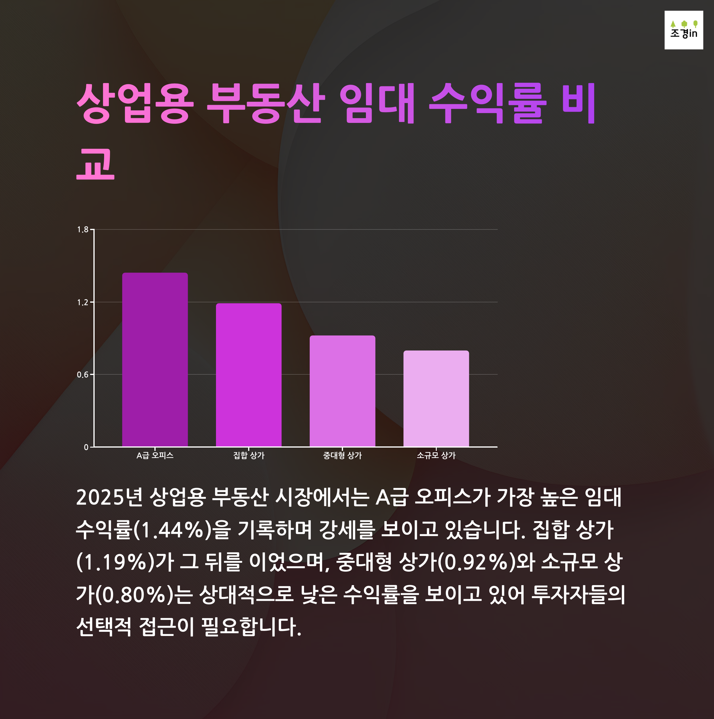 오피스는 투자수익률이 1.44%로 가장 높았고, 중대형 상가는 0.92%, 소규모 상가는 0.80%로 나타났습니다.