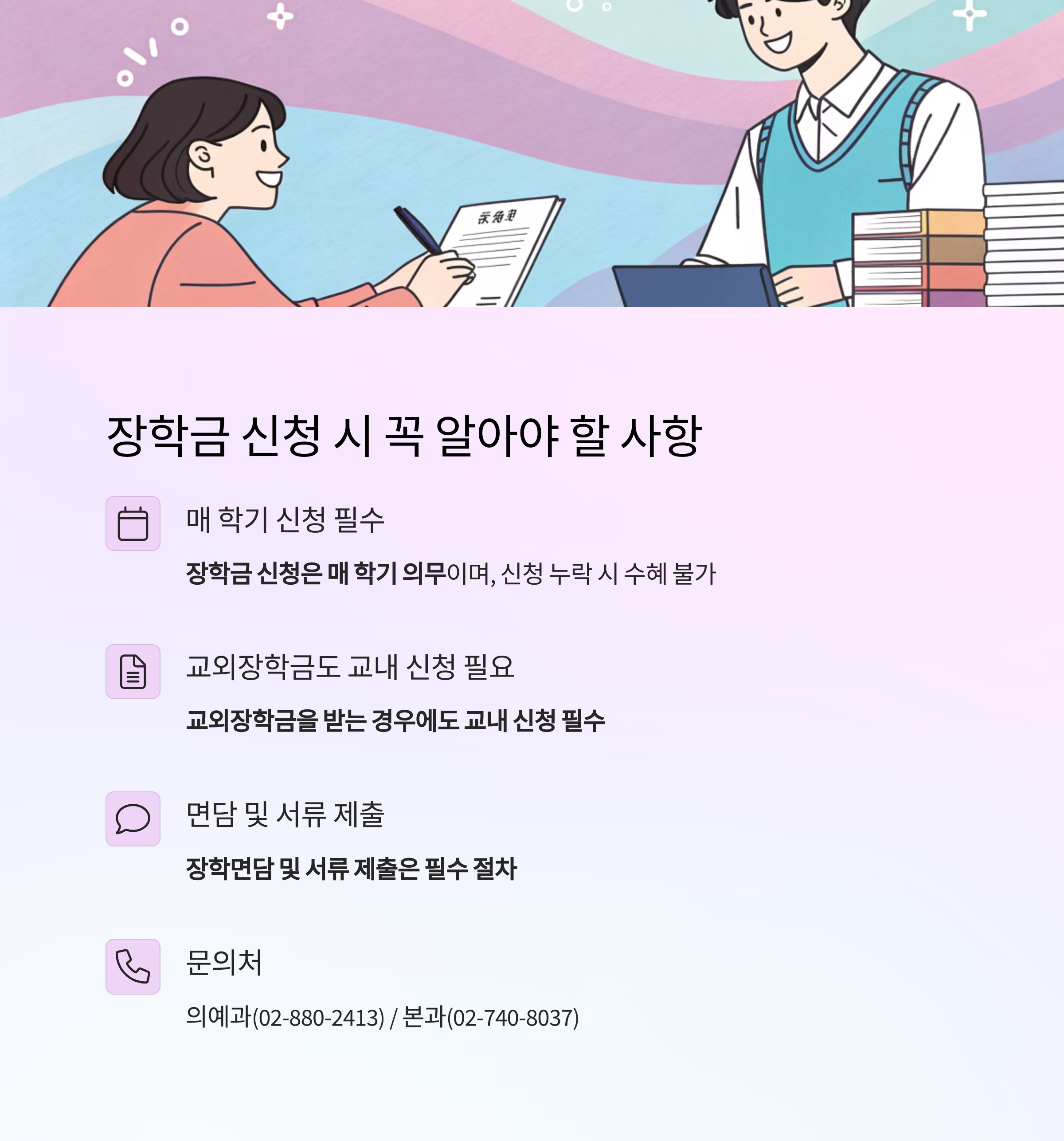 • 장학금 신청은 매 학기 의무이며, 신청 누락 시 수혜 불가