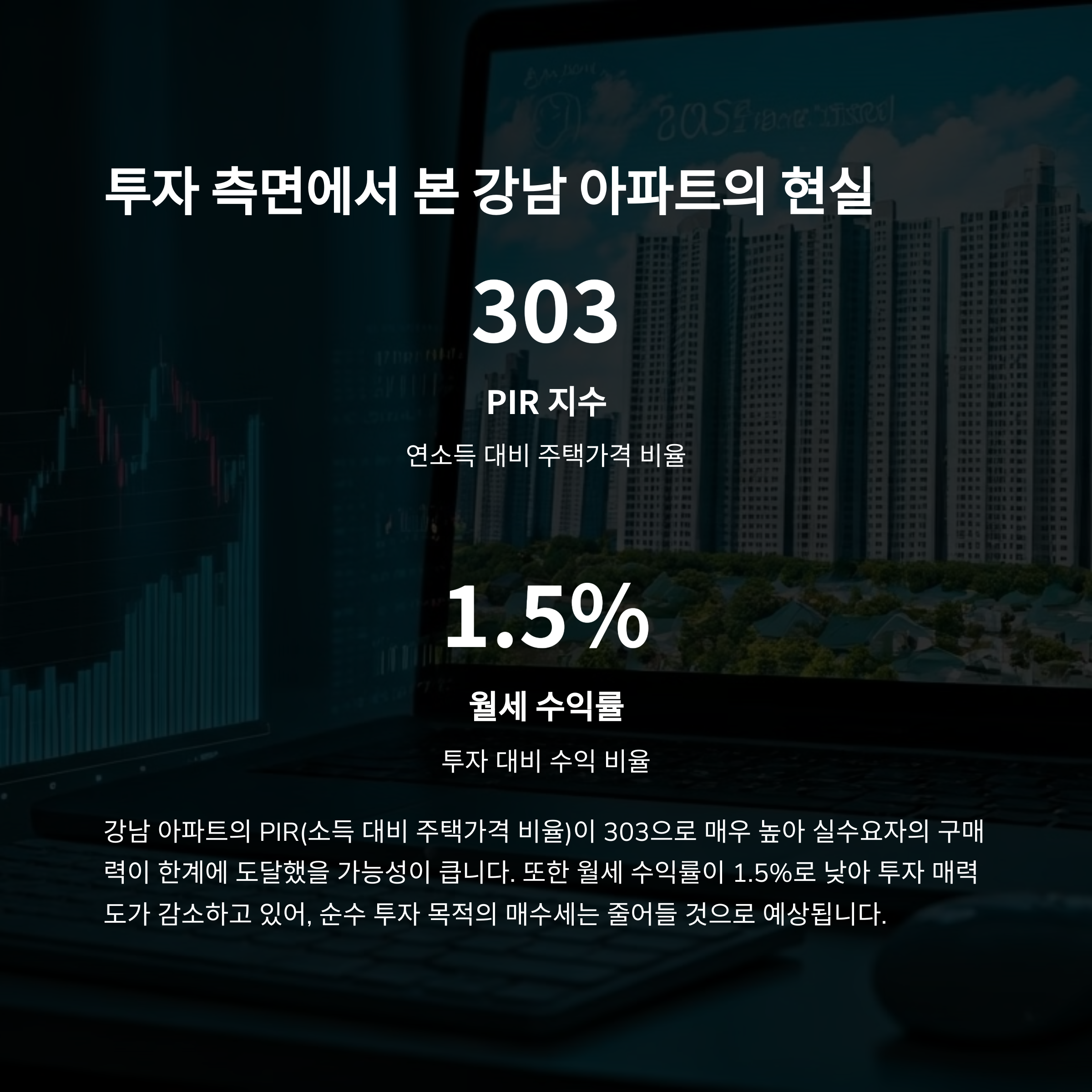 반면 높은 PIR(주택구입 부담 지수), 평균 303,은 실수요자의 구매력 한계를 나타냅니다.
