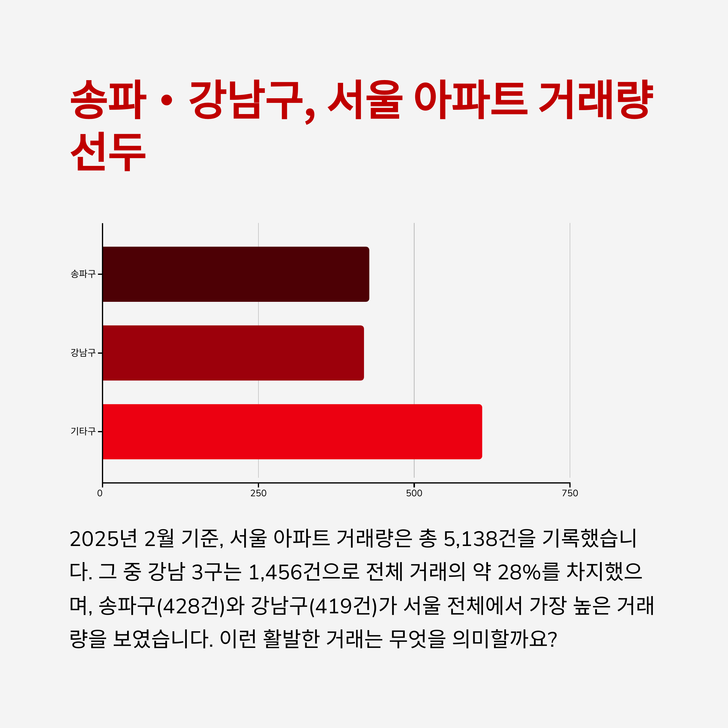 2025년 2월 기준, 서울 전체 거래량은 5,138건을 기록하며, 강남 3구인 강남구, 서초구, 송파구의 거래가 활발했습니다.