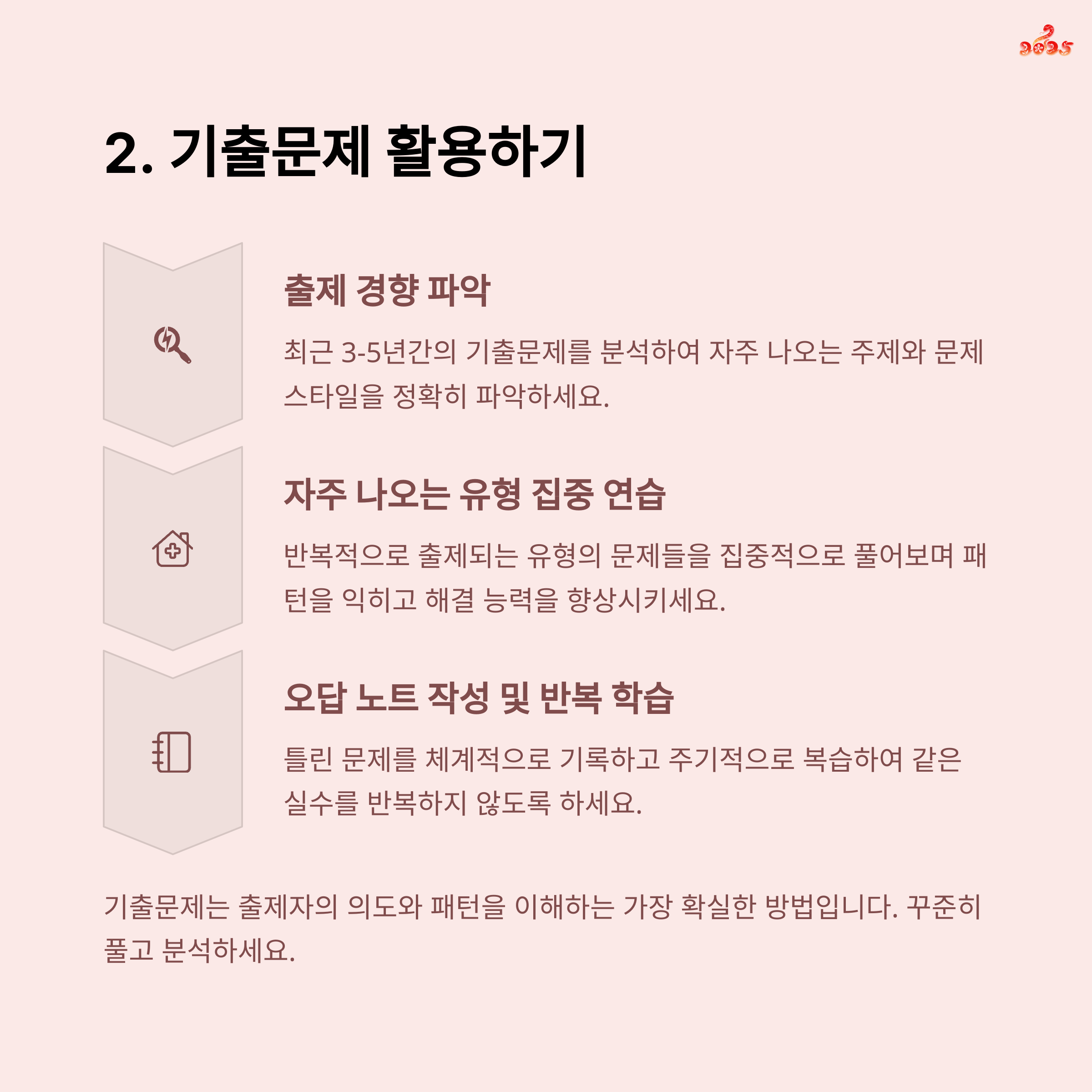 | 취약 과목 집중 | 기출문제 분석 | 시간 관리 |