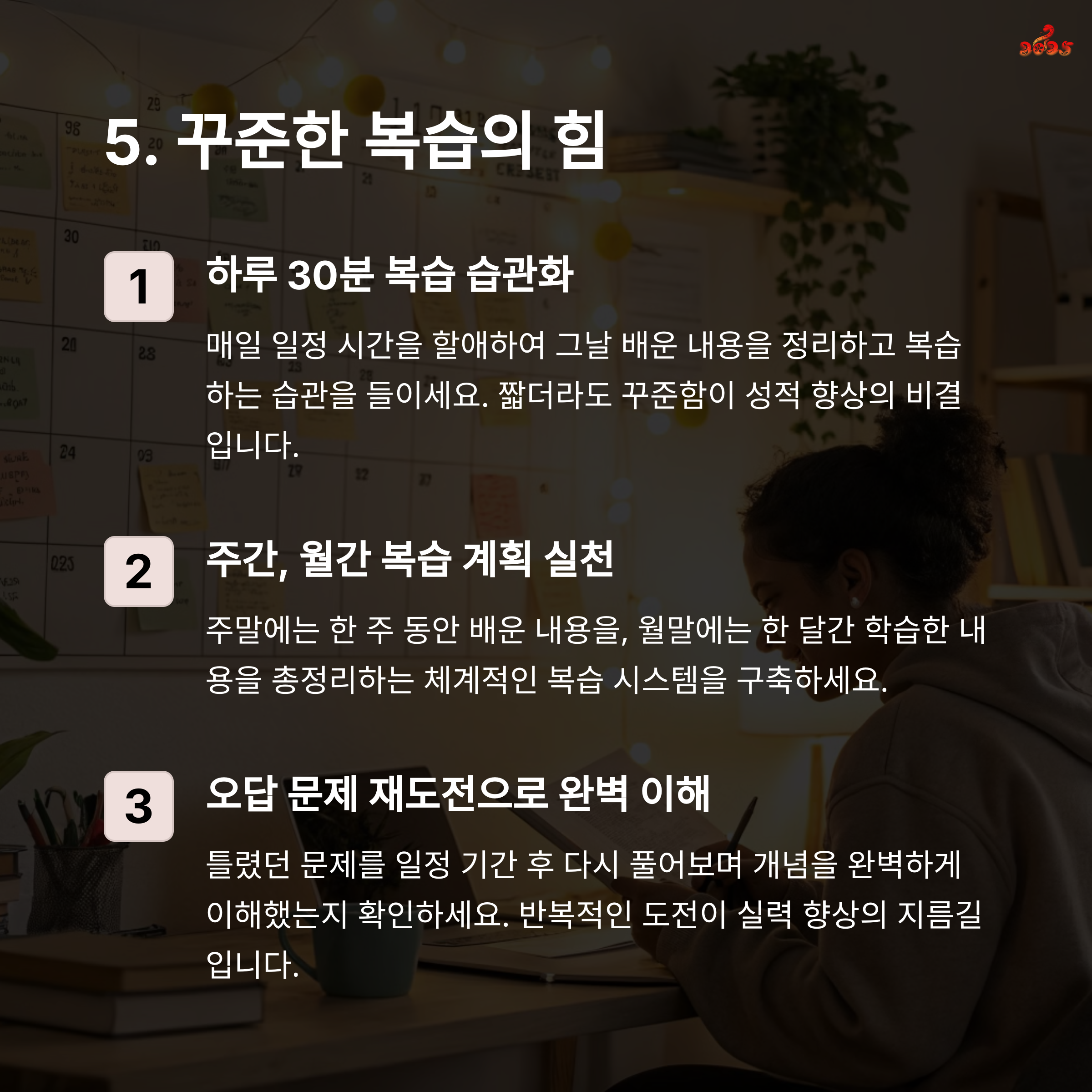 | 집중 학습을 위한 타이머 공부법 활용 | 틀린 문제 유형별 테마 정리 | 시간 안배 훈련을 통해 실전 감각 향상 |