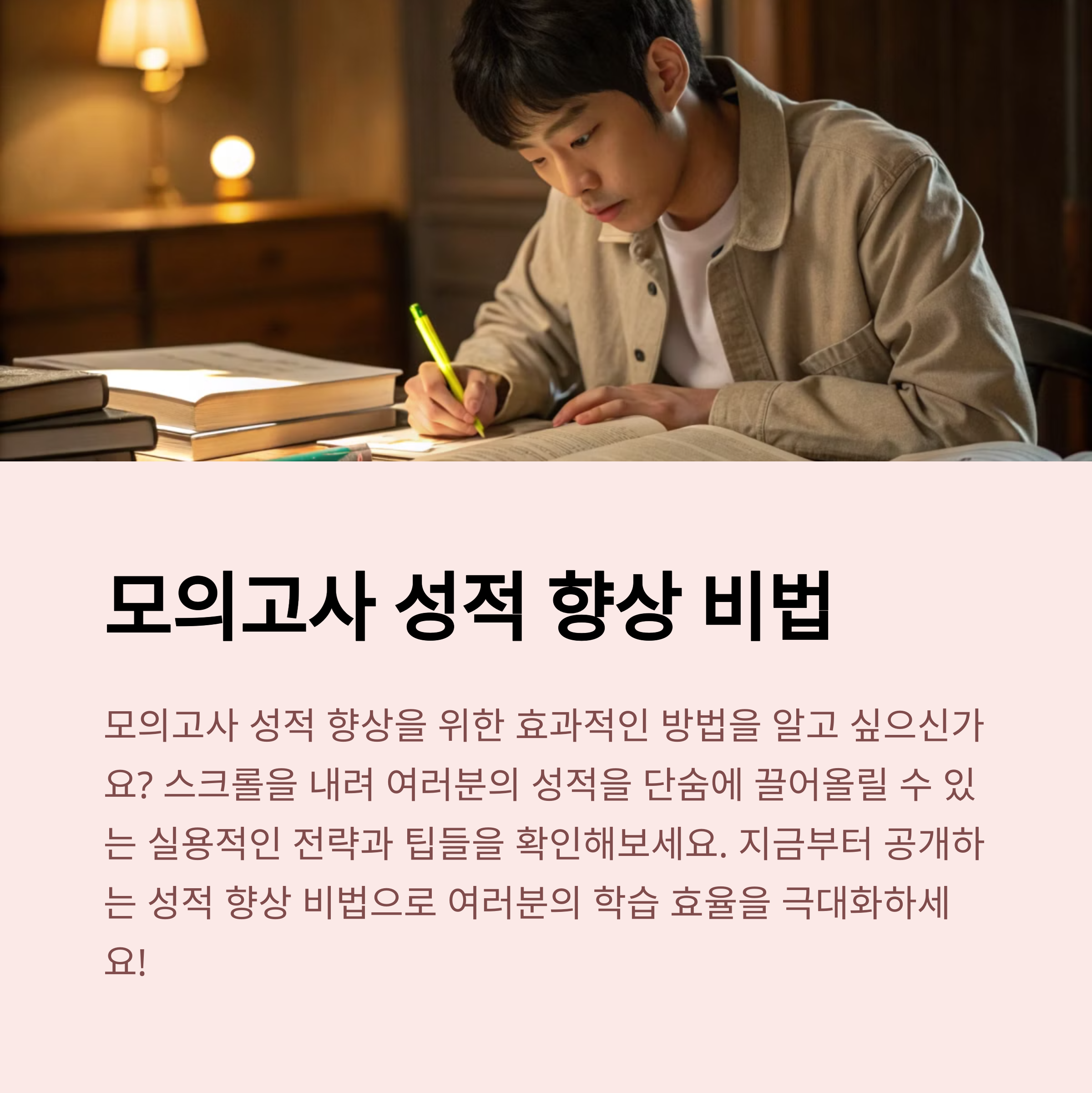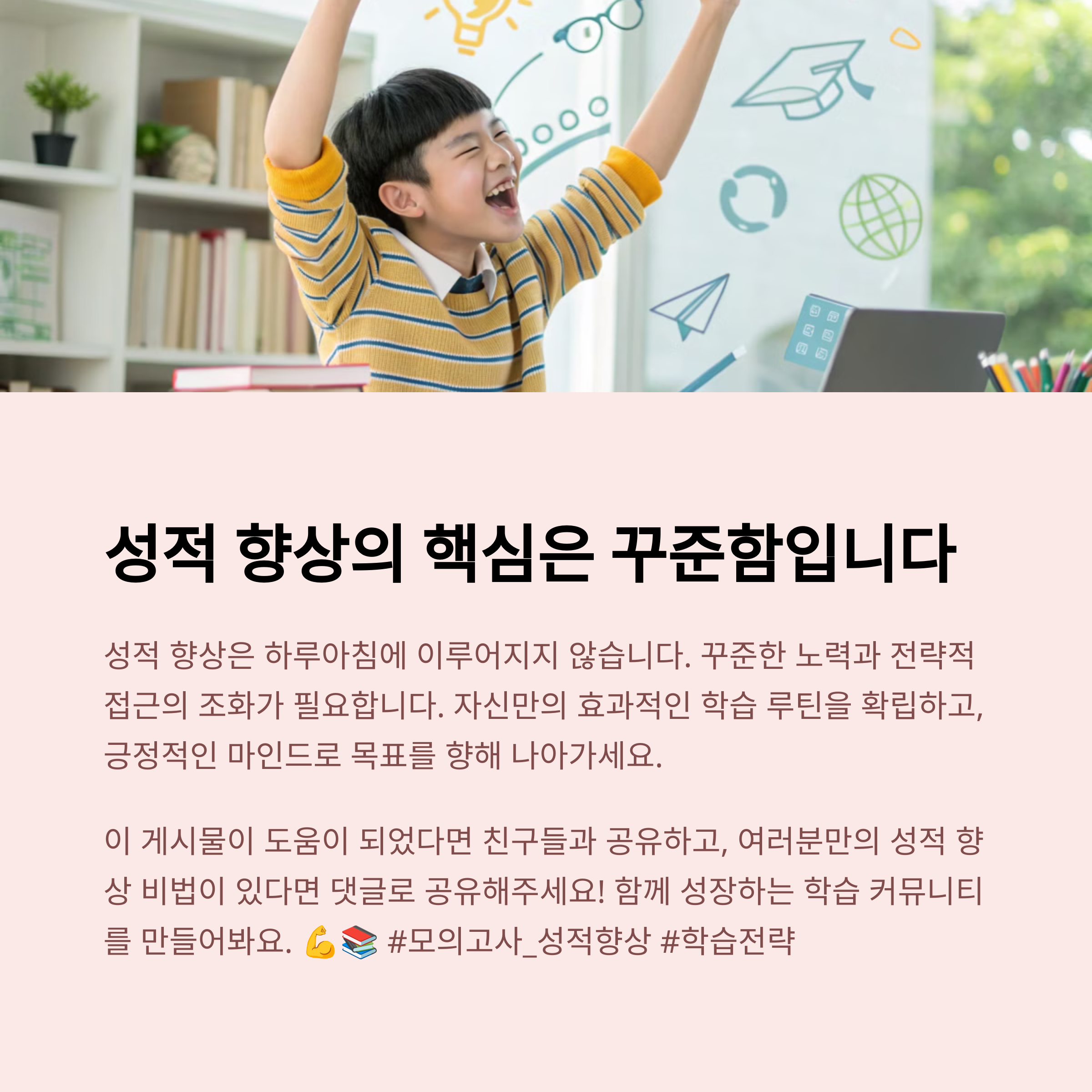 성적 향상은 단기간의 노력보다는 꾸준한 전략적 학습과 반복을 통해 이루어집니다. 모의고사는 단순한 평가가 아닌 학습의 이정표로 활용해야 하며, 매 시험 이후 철저한 분석과 복습이 동반되어야 실질적인 변화가 생깁니다. 오늘부터 방향 있는 학습을 시작해보세요. 목표를 향한 길은 때로 험난하지만, 정확한 전략과 꾸준한 실천이 있다면 누구나 그 끝에 도달할 수 있습니다.