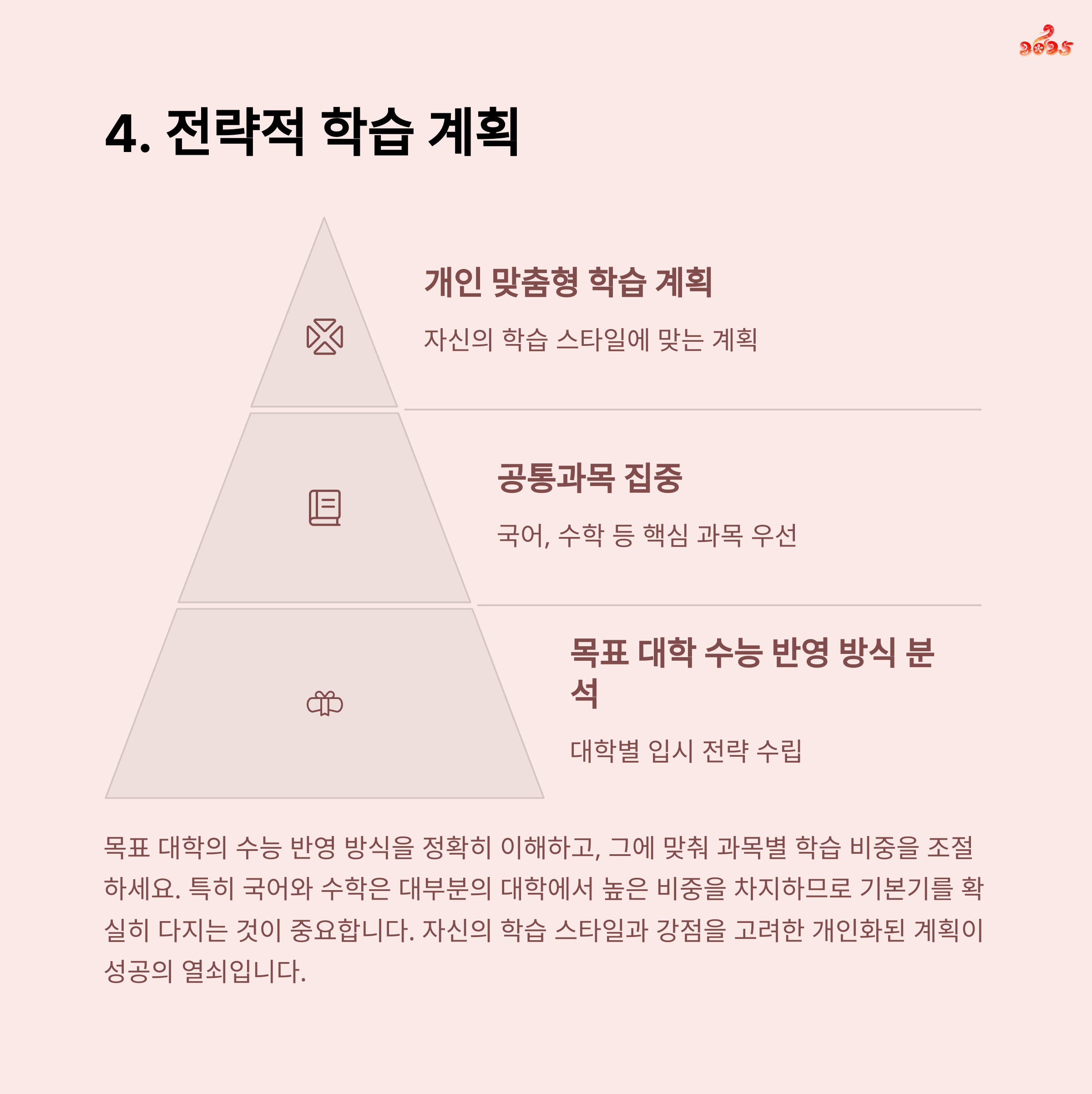 | 결과 분석을 통해 약점을 공략하는 전략 | 출제 경향 파악 및 오답 노트 활용 | 실전처럼 시간을 측정하며 문제풀이 연습 |
