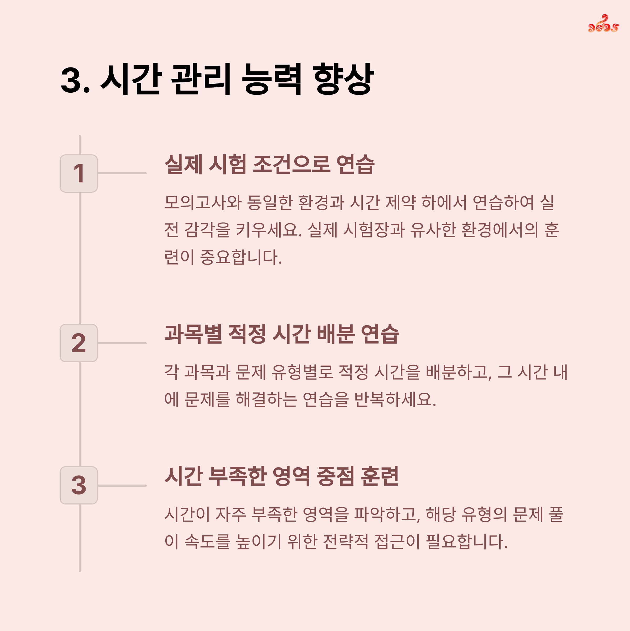 | 시간 관리 연습 | 실전처럼 문제를 풀며 시간 감각을 익히세요. |