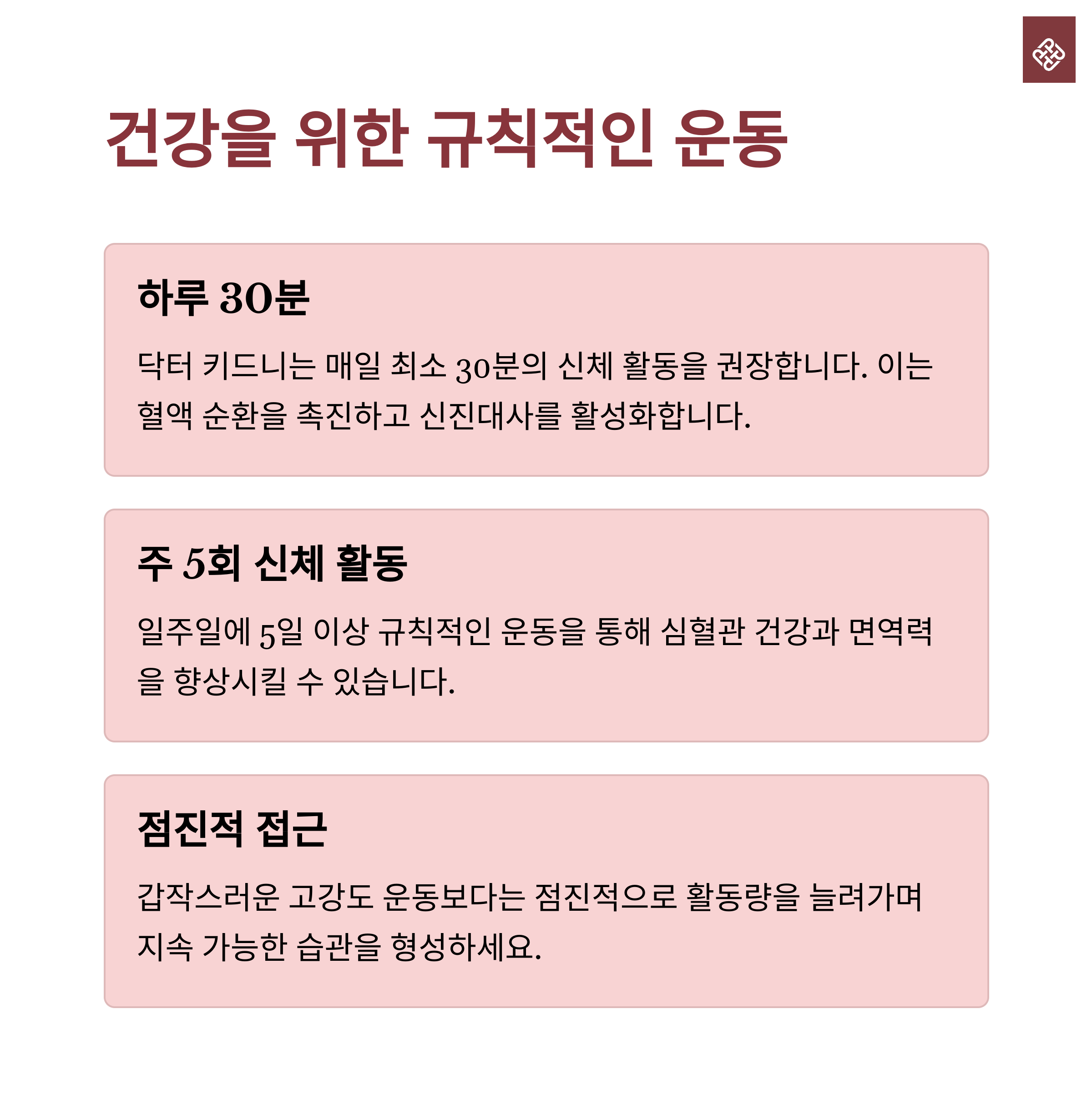 규칙적인 운동도 잊지 말아야 합니다. 매일 30분씩, 일주일에 5번 정도의 일상적인 신체활동은 건강을 회복하고 유지하는 데 매우 유익합니다.