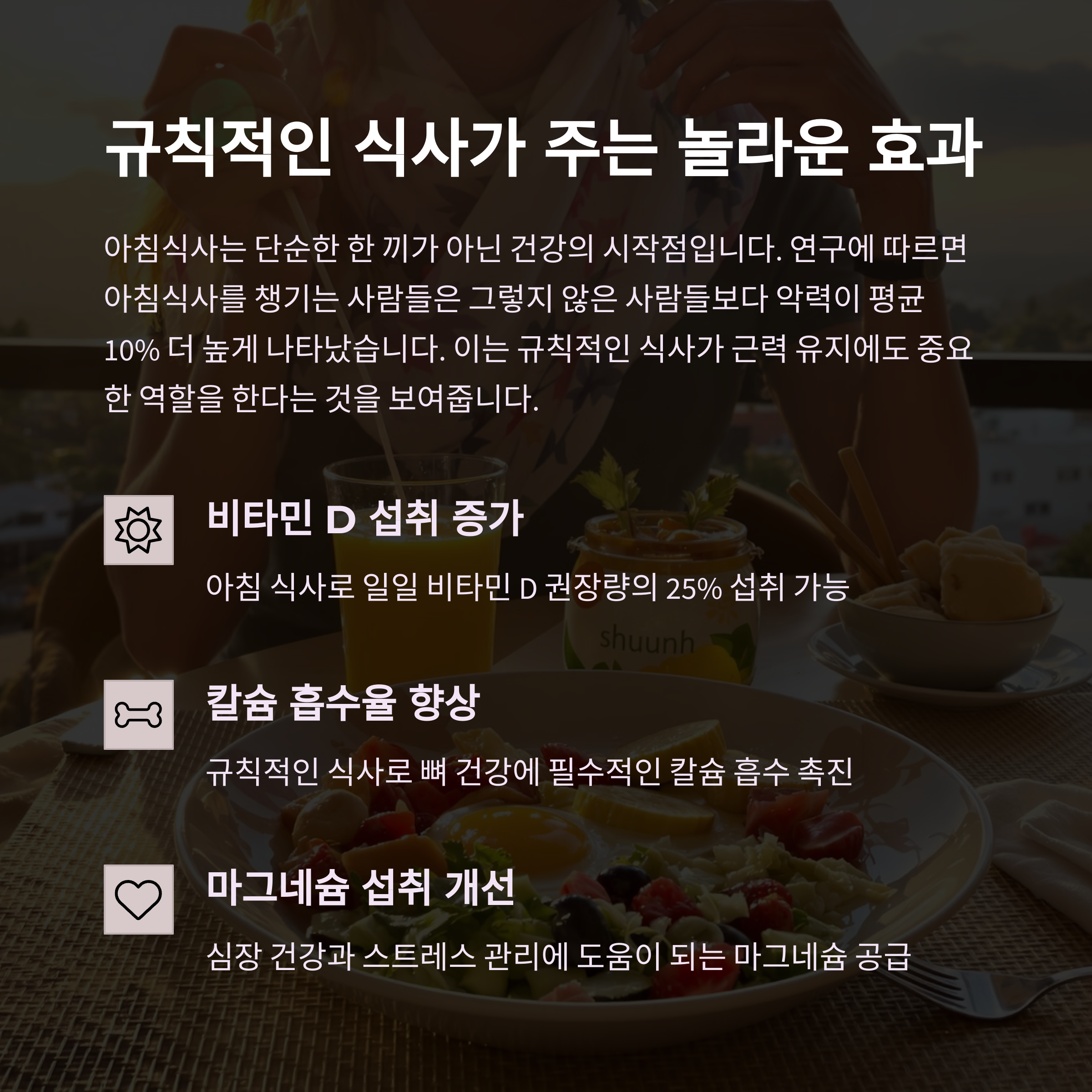 규칙적인 아침 식사는 활력을 높이고, 근육 건강과 밀접한 관련이 있습니다.