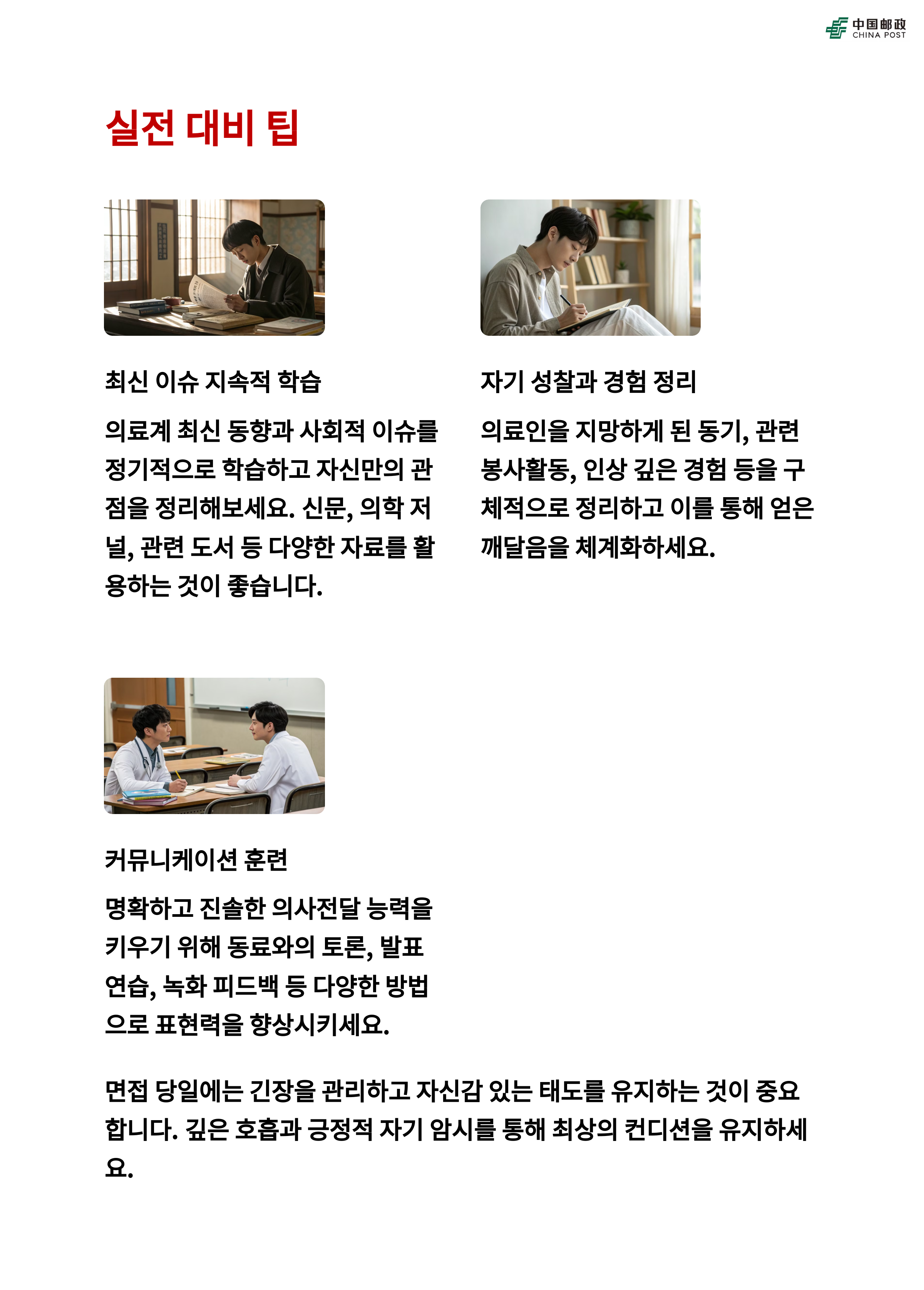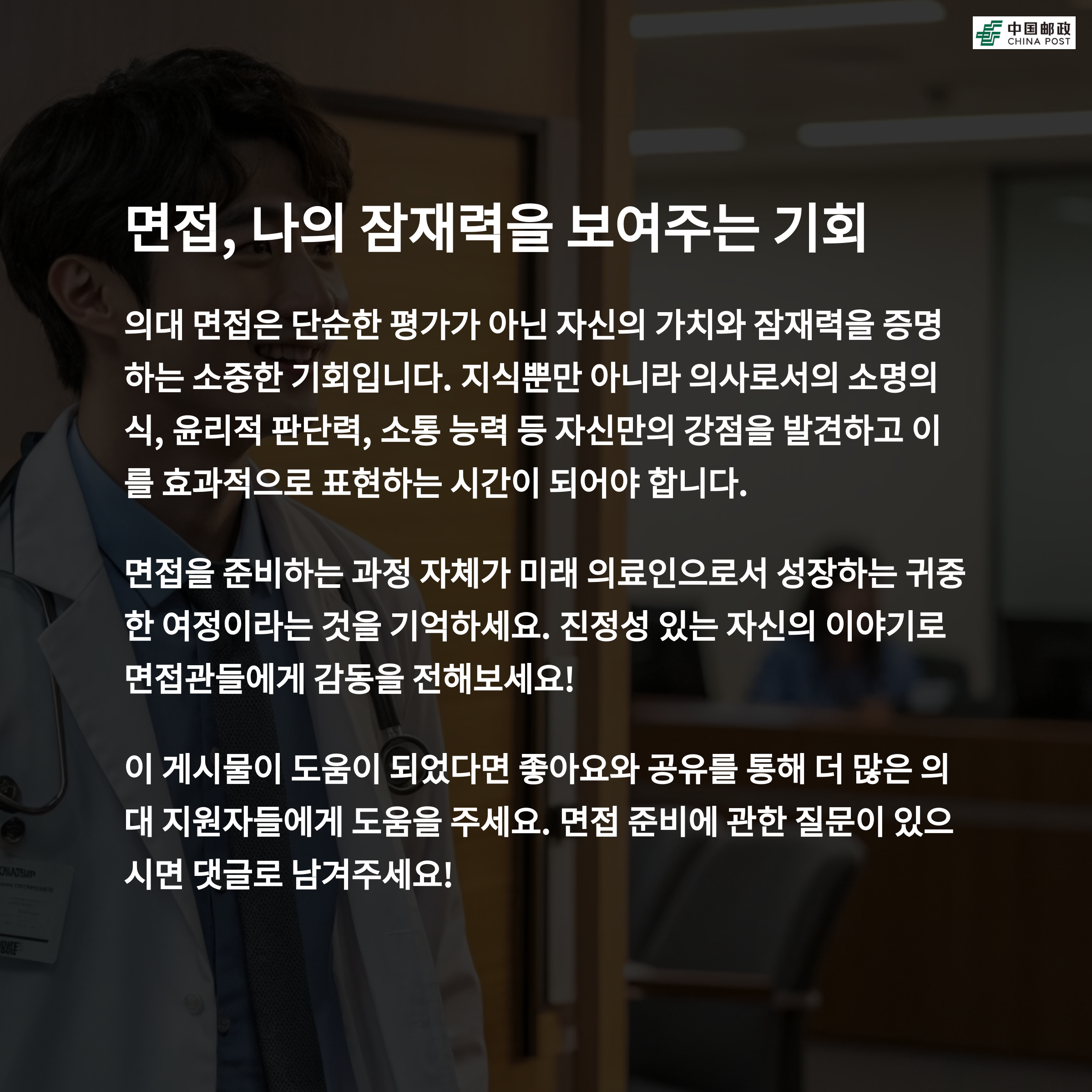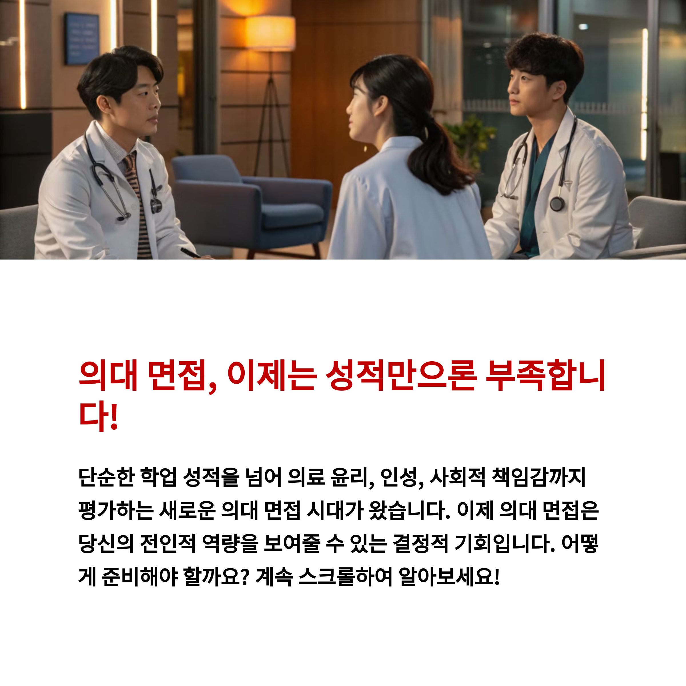 의대 면접 준비, 여러분은 어떤 방식으로 하고 계신가요? 도움이 되었던 자료나 기억에 남는 면접 질문이 있다면 댓글로 공유해주세요!