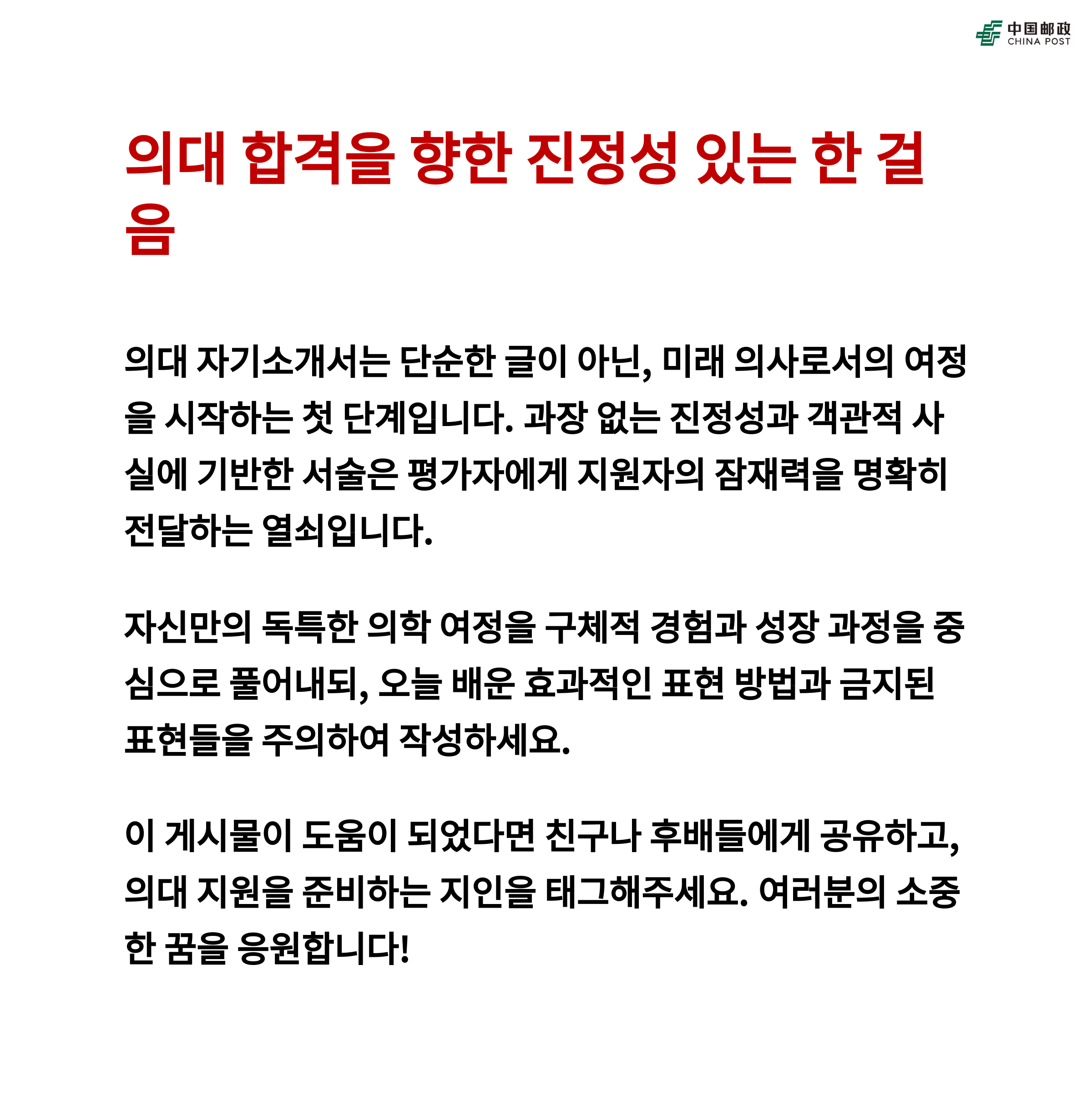 의대 자소서는 단순한 스펙 나열이 아니라, 지원자의 사고방식과 진로에 대한 태도를 평가하는 중요한 요소입니다. 본문의 금기 표현들은 일상적으로 자주 쓰지만, 자소서에서는 오해의 여지나 평가 절하로 연결될 수 있는 위험 요소입니다. 구체적 경험 + 능동적 표현 + 진정성 이 세 가지를 기준으로 삼아 자소서를 점검해보세요. 당신의 진심이 잘 전달될 수 있도록 응원합니다!