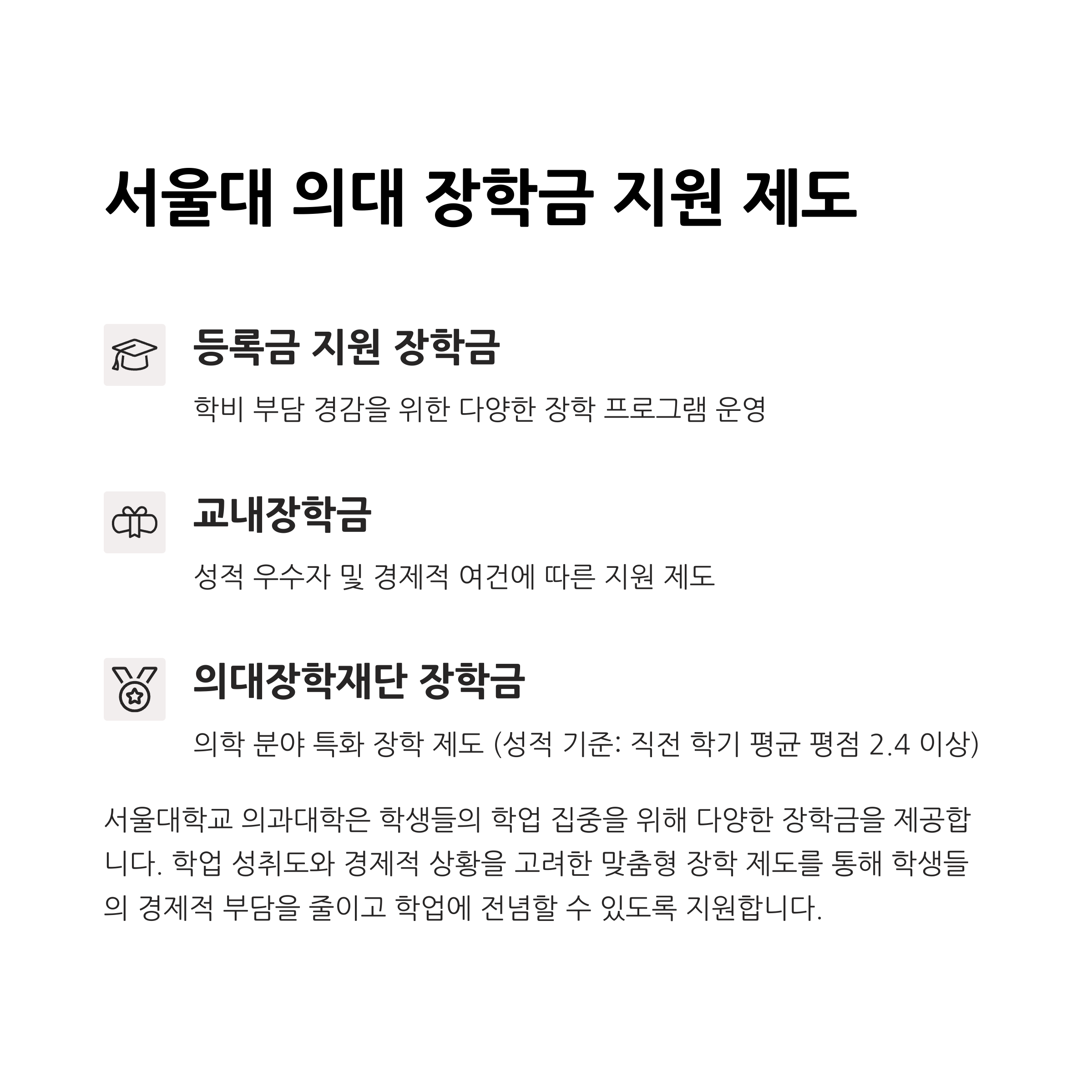 | 의대 장학제도 | 국가·교내 장학금 등 다양한 제도 활용 가능 |