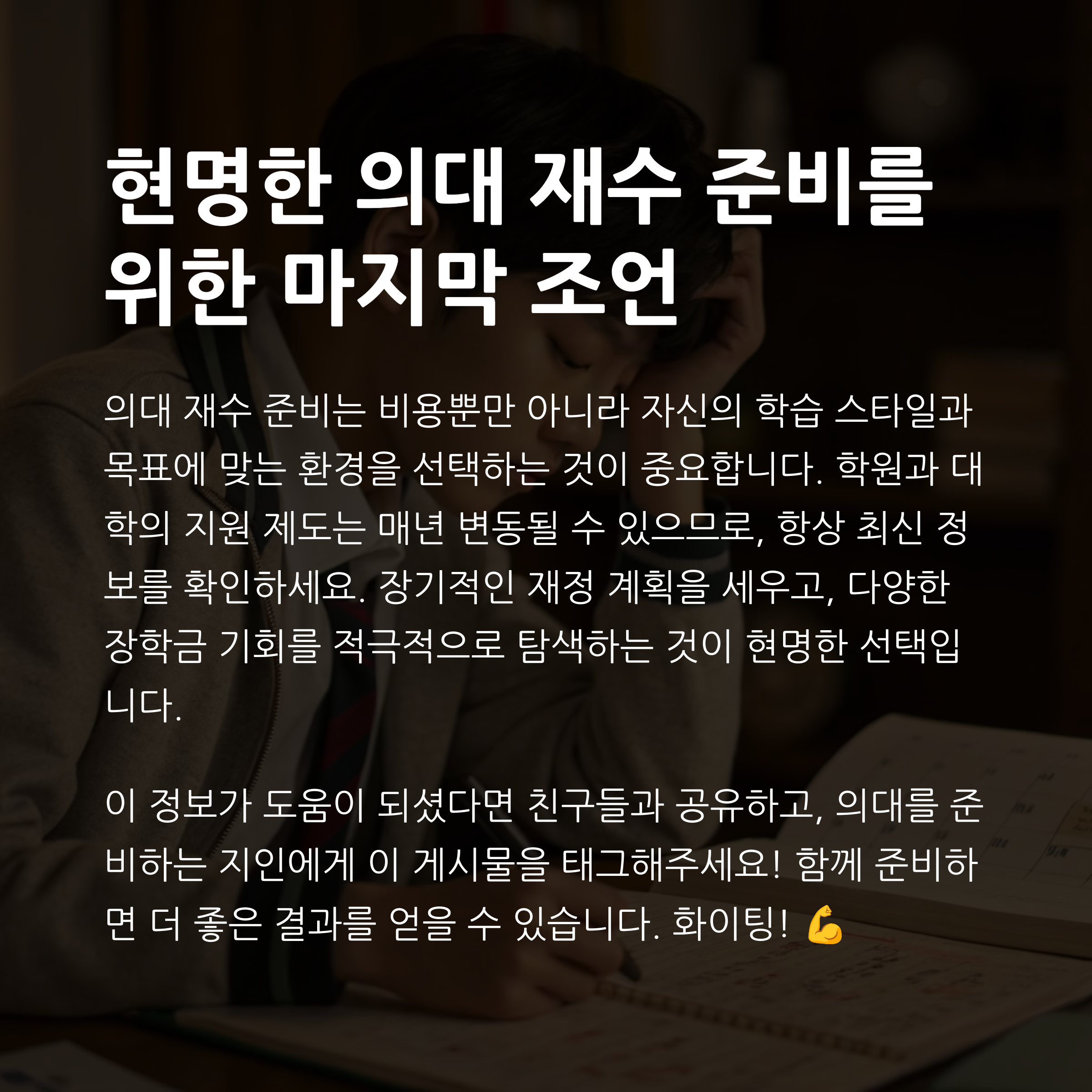 이 글을 읽고 궁금한 점이 있으셨나요? 또는 여러분만의 의대 재수 준비 팁이 있다면 아래 댓글로 자유롭게 공유해주세요. 함께 나누면 더 큰 도움이 됩니다!
