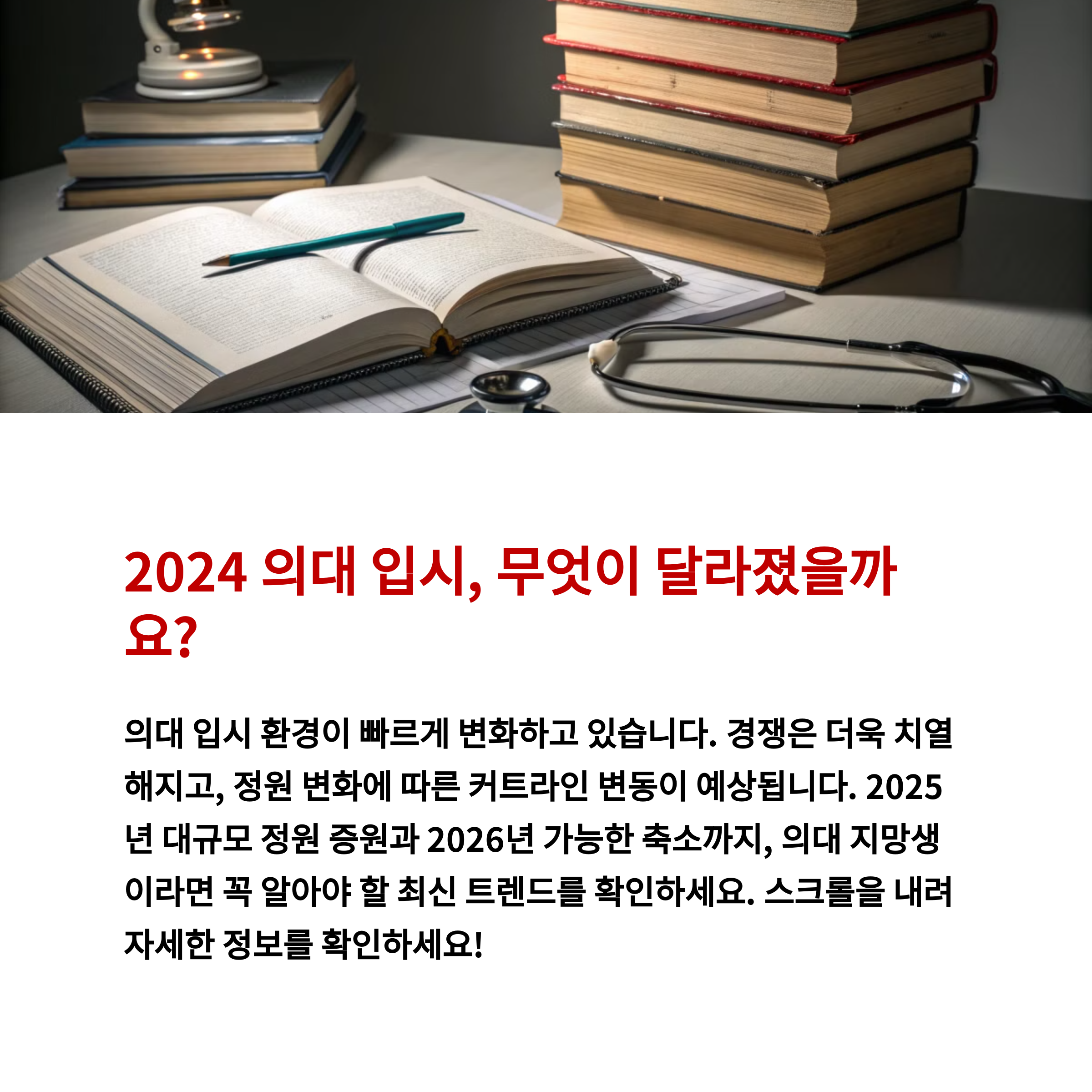 매년 높아지는 의대 커트라인에 수험생과 학부모들의 관심이 집중되고 있습니다. 특히 최근 3년간 내신 등급 상승과 수능 점수 증가는 상위권 대학을 목표로 하는 학생들에게 더욱 치열한 경쟁을 예고하고 있습니다. 하지만 2025학년도에는 의대 정원 증원이라는 대대적인 변화가 예고되면서 정시 커트라인이 일시적으로 하락</strong할 수 있다는 분석이 이어지고 있죠. 과연 이 변화가 어떤 결과를 가져올지, 2022학년도부터 2024학년도까지의 구체적인 데이터를 중심으로 의대 입시의 큰 흐름을 짚어보려 합니다. 수험생 여러분이 준비에 참고할 수 있도록 핵심 내용을 빠짐없이 담았습니다. 함께 살펴보시죠.