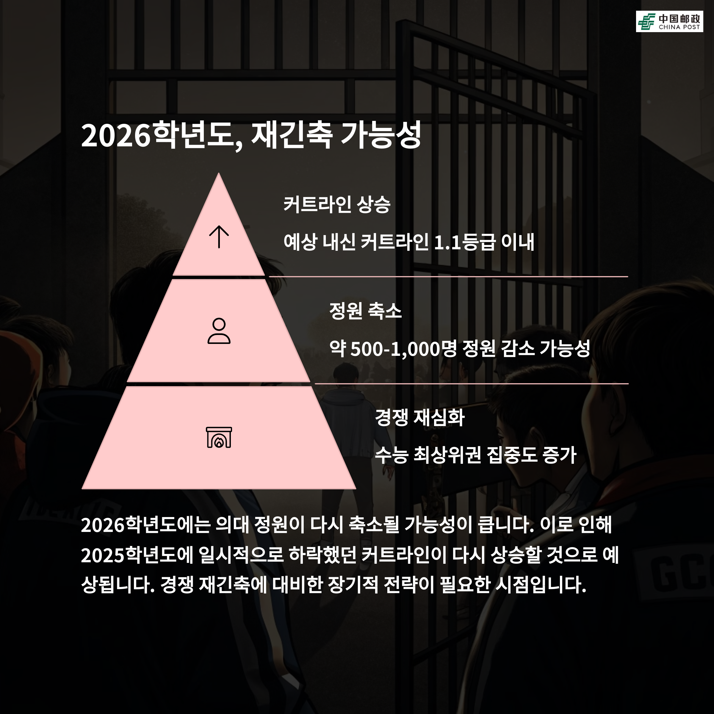 | 상위권 내신 경쟁 심화, 1등급 초반에서 결정 | 정시 지원 전략 유연성 요구됨 | 사탐 선택 증가, N수생 증가도 변수로 작용 |
