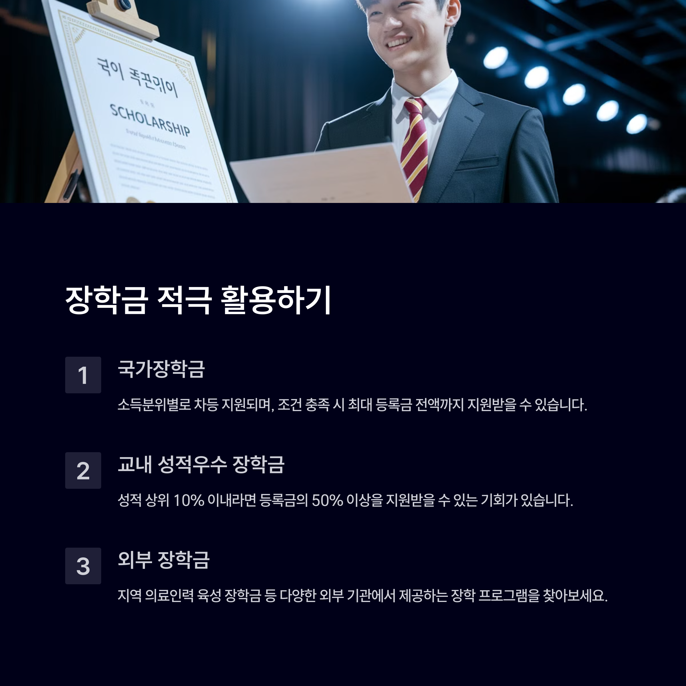 장학금은 학비 부담을 줄이는 가장 효과적인 방법 중 하나입니다. 국가 장학금, 학교에서 제공하는 성적 우수 장학금, 그리고 다양한 외부 기관 장학금이 존재합니다. 특히 의대생을 위한 특정 장학금이 많으니 꼼꼼히 찾아보는 것이 중요합니다.