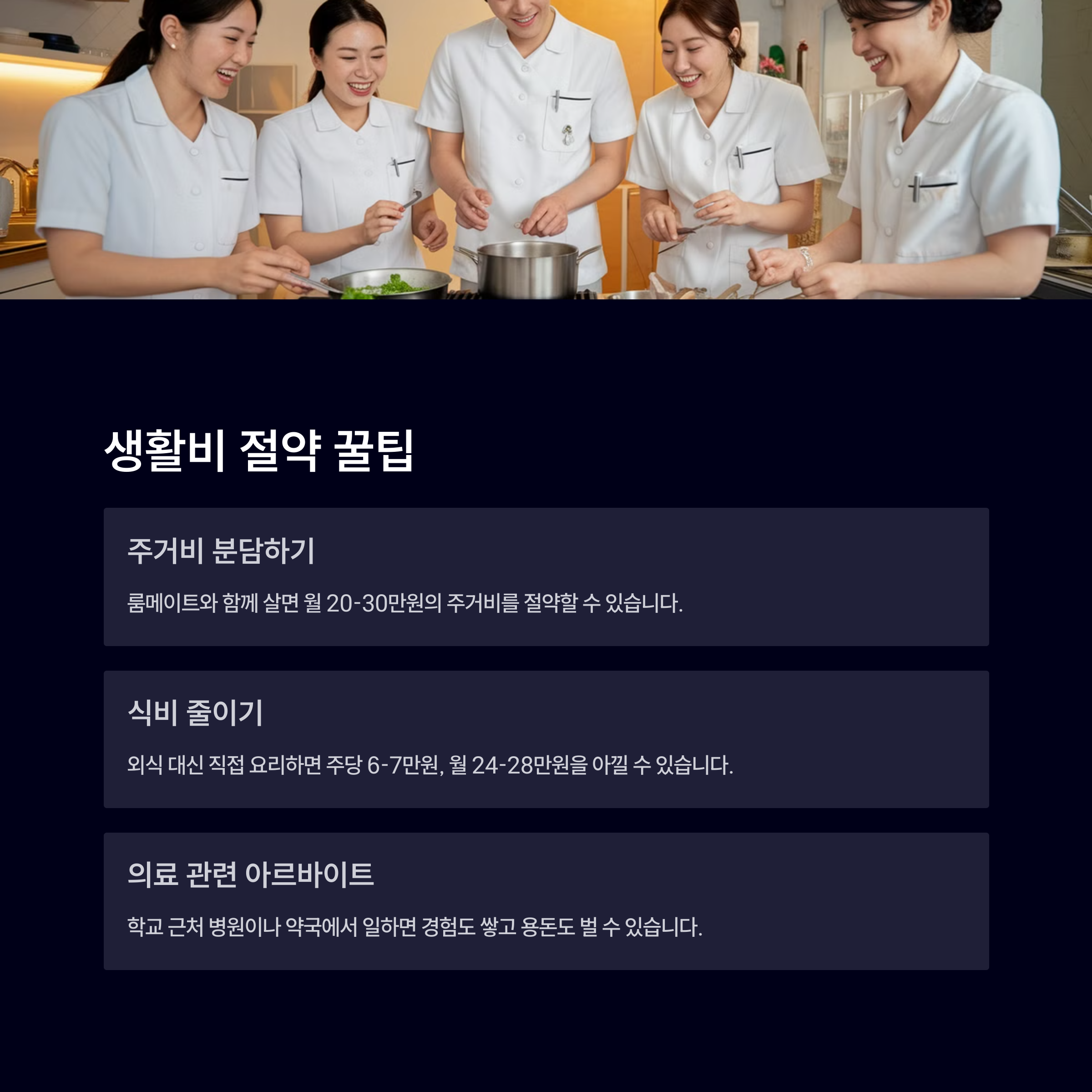 | 식비 | 학교 식당, 기숙사 식사 이용, 식재료 공동 구매 |