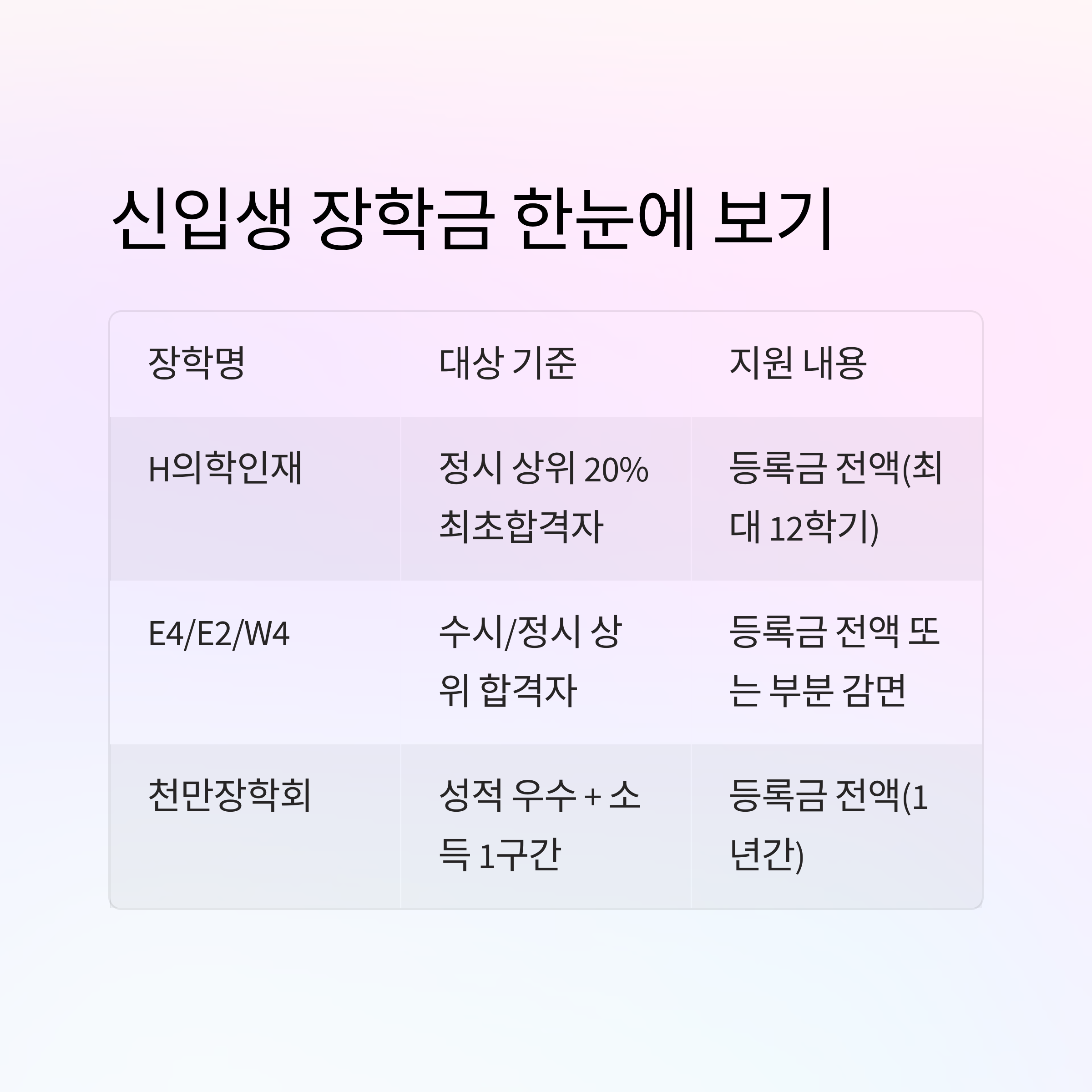 | E4/E2/W4 등 | 수시/정시 상위 합격자 | 등록금 전액 또는 부분 감면 |