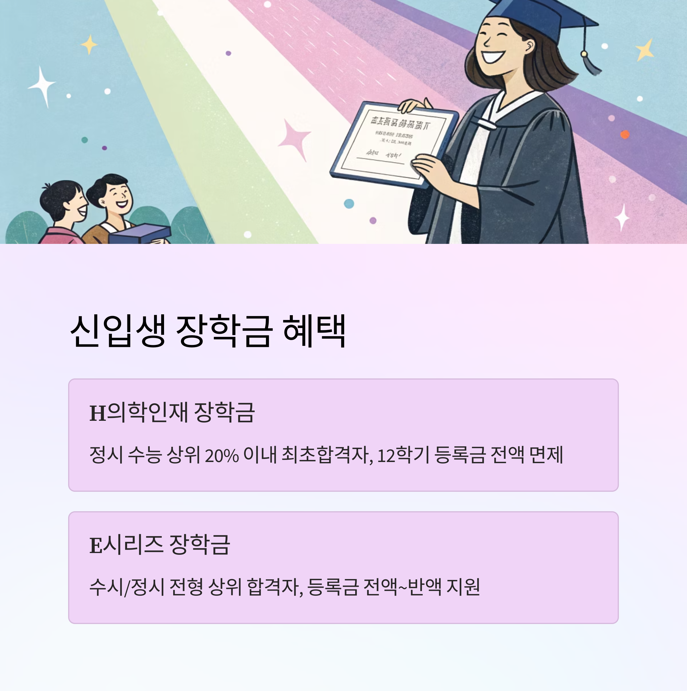 | H의학인재 장학금 | 정시 상위 20% 최초합격자 | 등록금 전액(최대 12학기) |