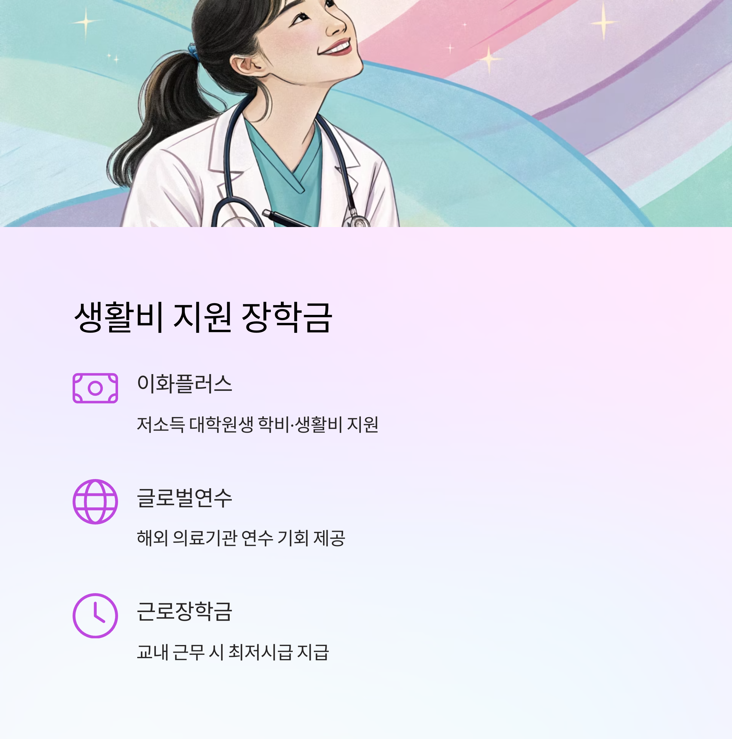 이화여자대학교 의과대학은 우수 입학생 장학금부터 재학생 성적장학, 생활비, 공중보건장학까지