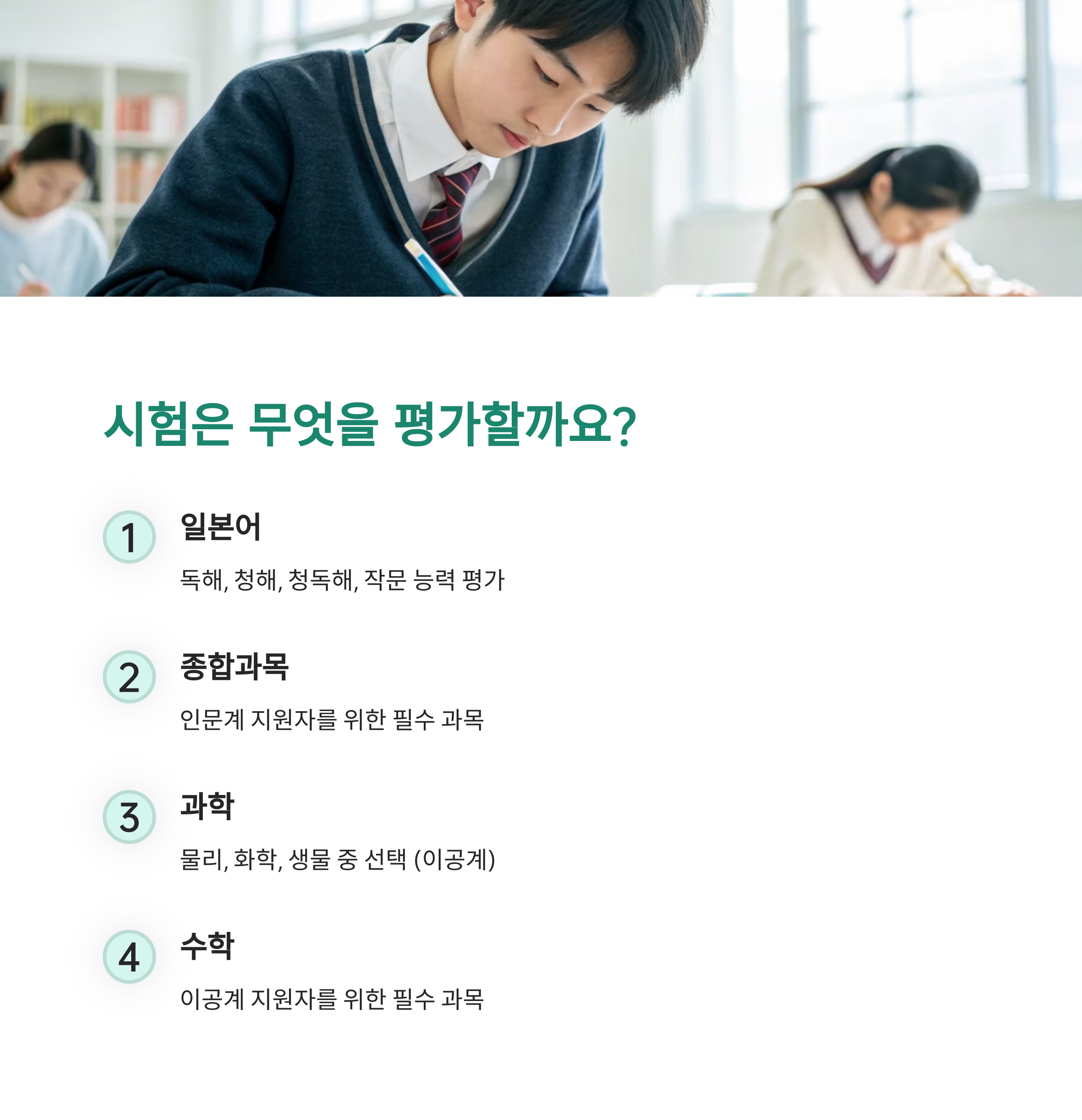 EJU 시험 과목은 크게 네 가지로 나뉩니다. 첫 번째는 일본어로, 독해, 청해, 청독해, 작문으로 구성됩니다. 두 번째는 종합과목으로, 인문계열을 지원하는 학생들에게 적합합니다. 세 번째는 과학 과목(물리, 화학, 생물 중 선택)이며, 마지막은 수학(이과형/문과형 선택)으로 이공계 학생들에게 필수적입니다. 자신이 지원하려는 대학 및 전공에서 요구하는 과목을 미리 확인하는 것이 중요합니다.
