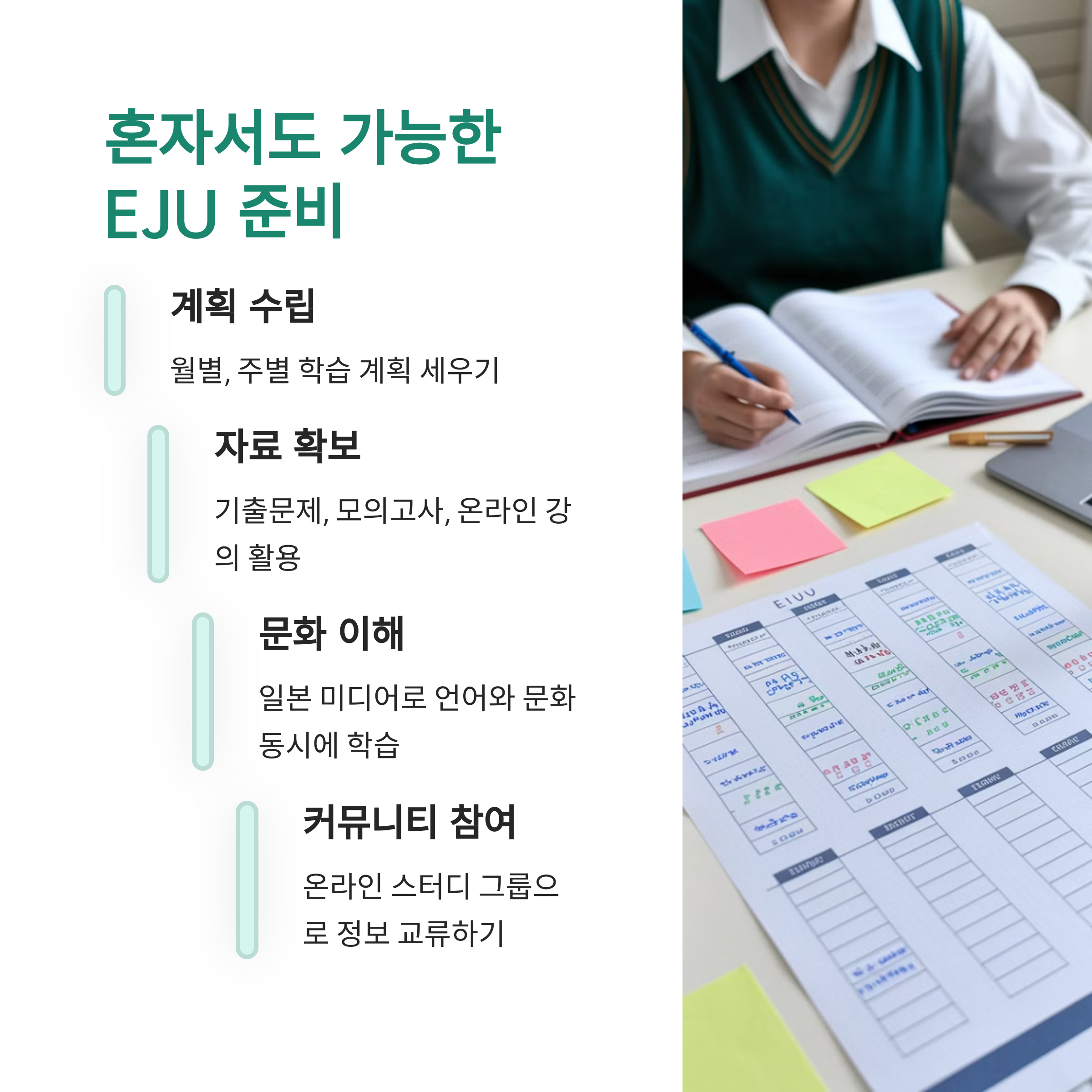 효과적인 EJU 대비를 위해서는 독학과 학원 수강을 병행하는 것이 좋습니다. 기출문제를 분석하고, 체계적인 학습 계획을 세우며, 모의고사를 활용하여 실전 감각을 익히는 것이 중요합니다. 또한, 자신이 부족한 부분을 파악하고 보완하는 것이 시험 성공의 핵심입니다.
