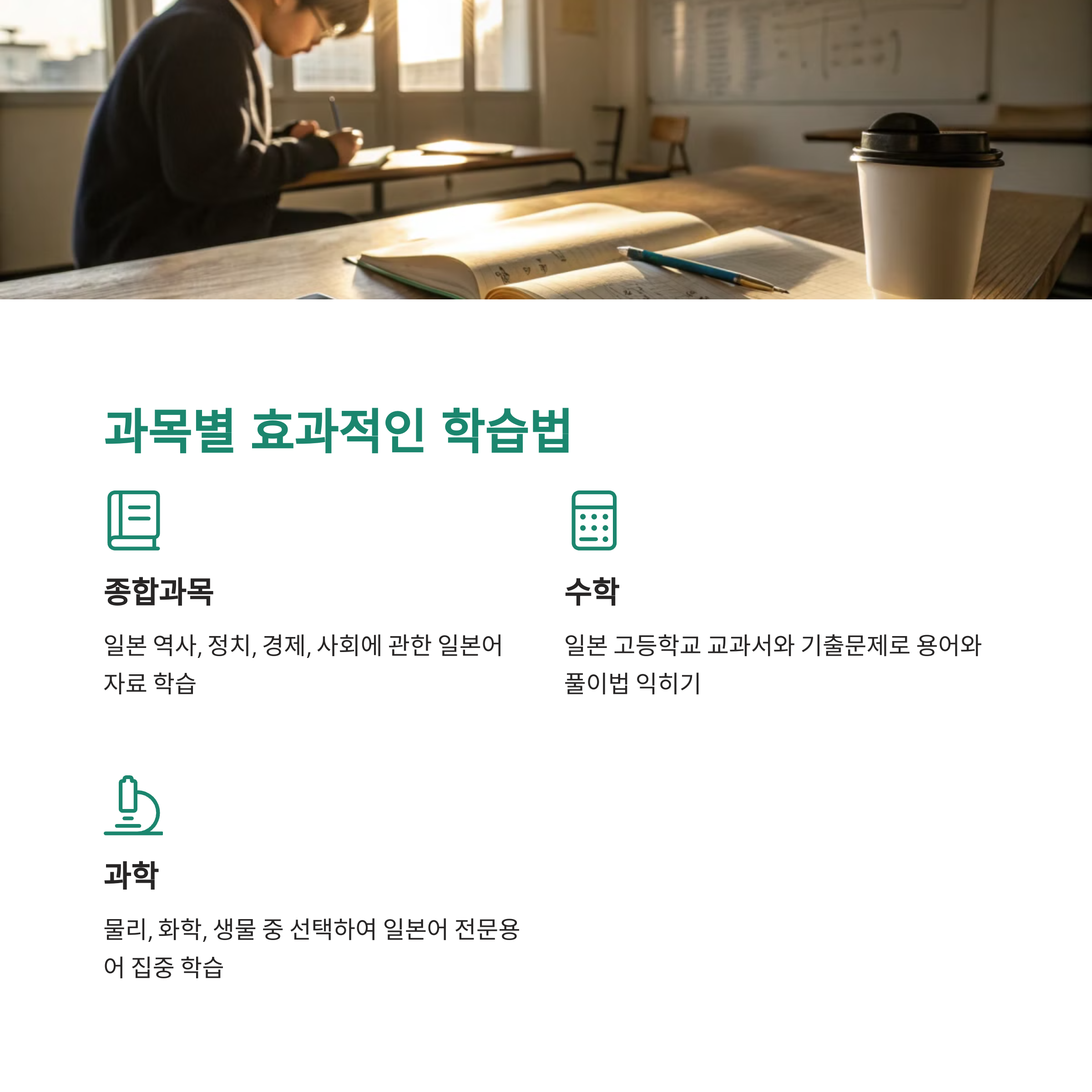 EJU 시험 과목은 크게 네 가지로 나뉩니다. 첫 번째는 일본어로, 독해, 청해, 청독해, 작문으로 구성됩니다. 두 번째는 종합과목으로, 인문계열을 지원하는 학생들에게 적합합니다. 세 번째는 과학 과목(물리, 화학, 생물 중 선택)이며, 마지막은 수학(이과형/문과형 선택)으로 이공계 학생들에게 필수적입니다. 자신이 지원하려는 대학 및 전공에서 요구하는 과목을 미리 확인하는 것이 중요합니다.