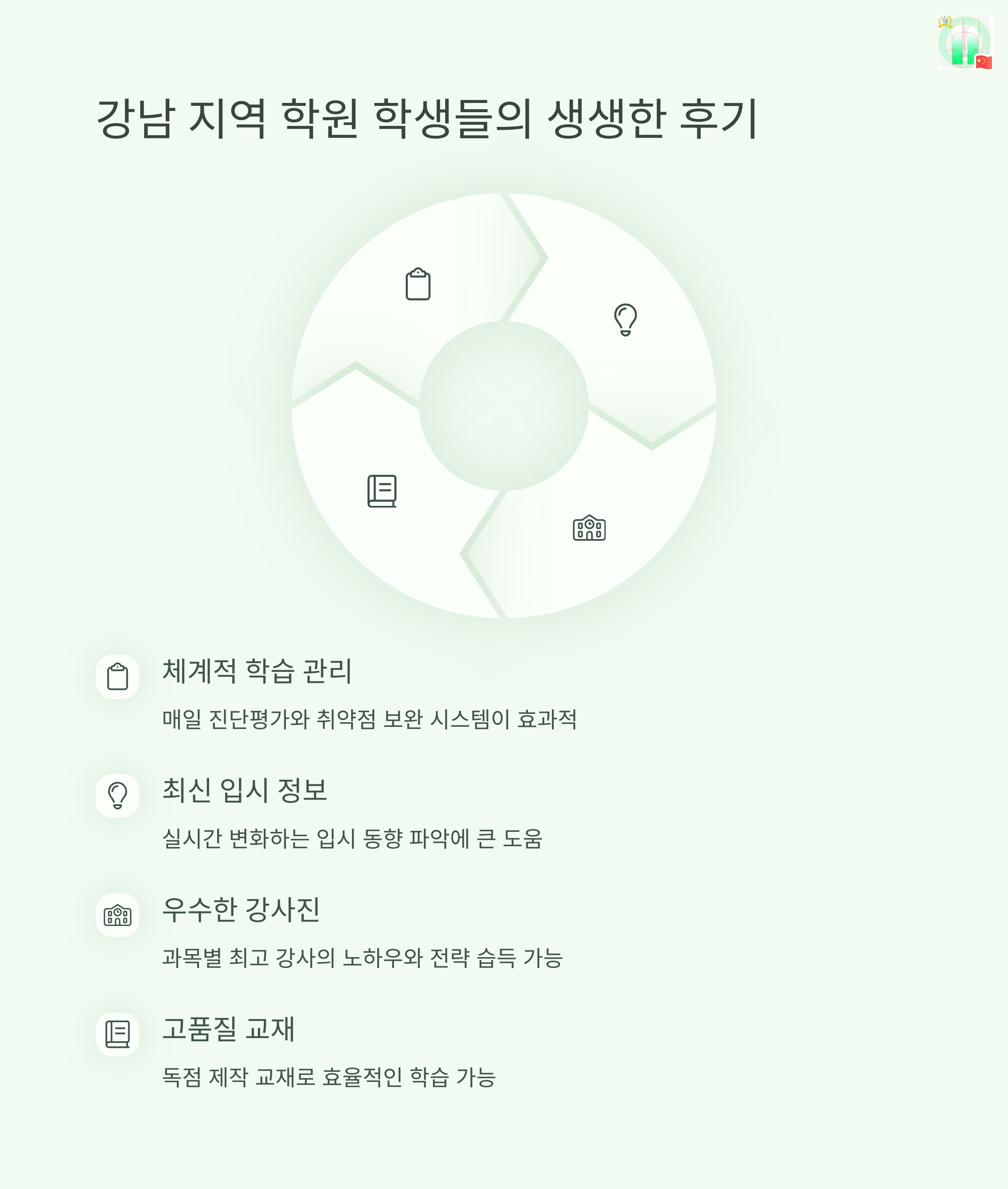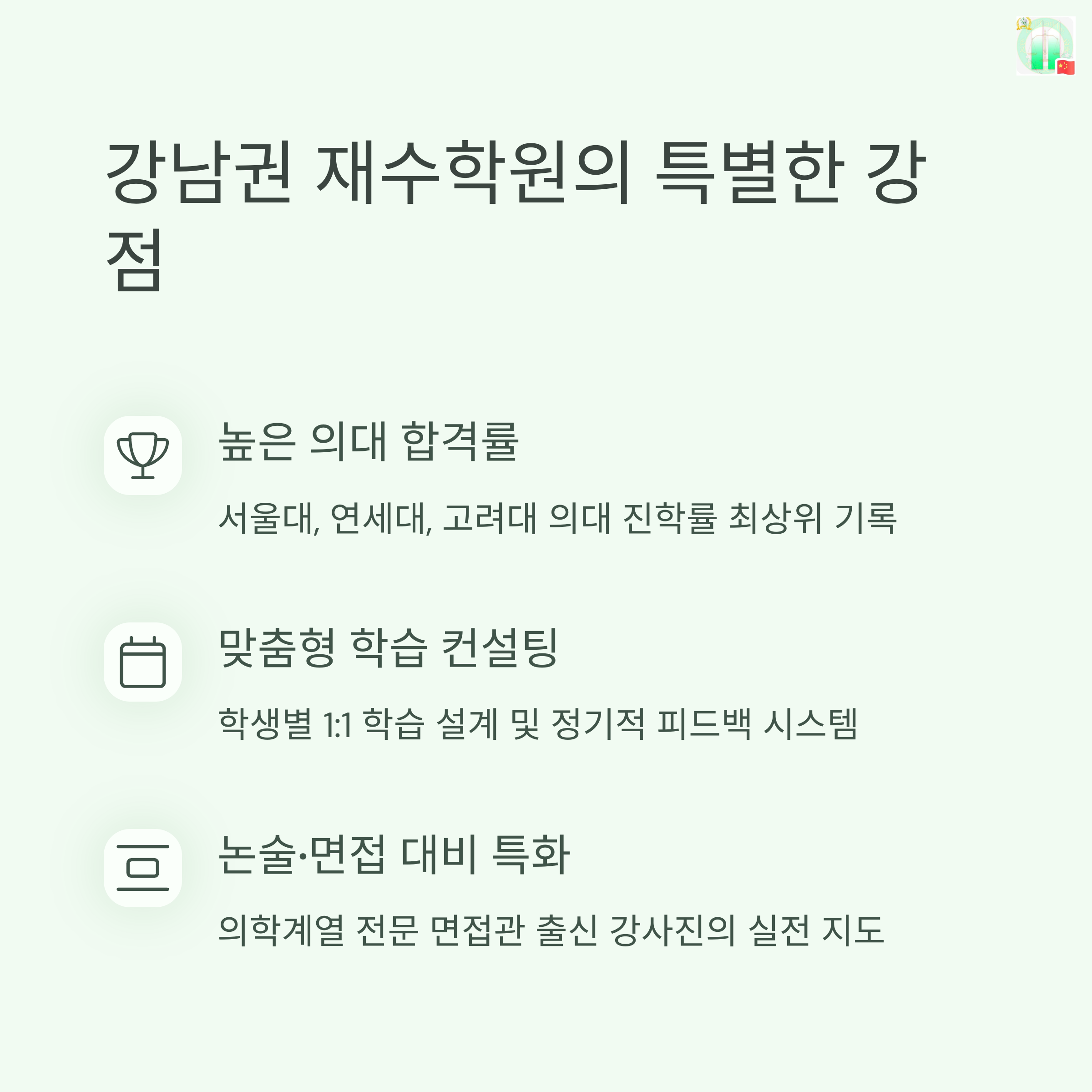 | 강남 재수학원 특징 | 철저한 관리와 높은 합격률, 경쟁 심리 압박도 큼 |
