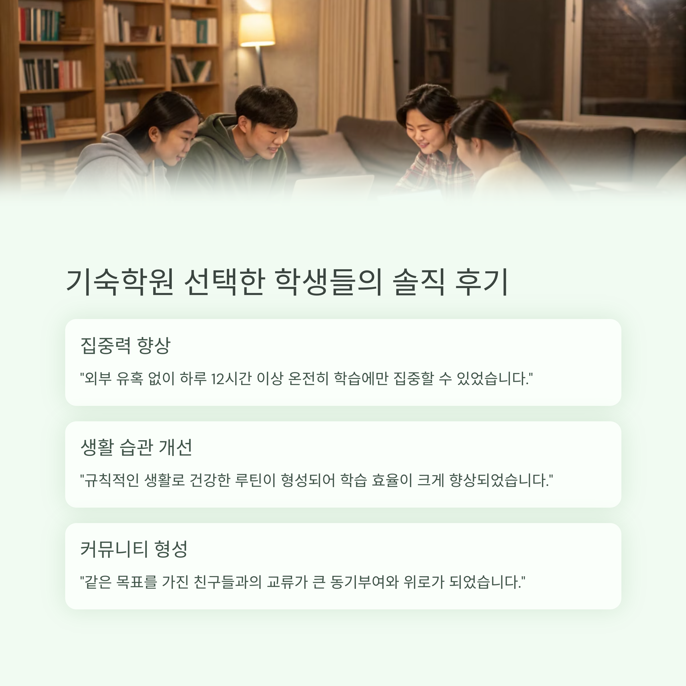 | 후기 상 관리와 피드백 체계 우수 | 휴대폰 제한, 야간 자습 등 규율 강화 | 개인 성향 따라 만족도 차이 있음 |