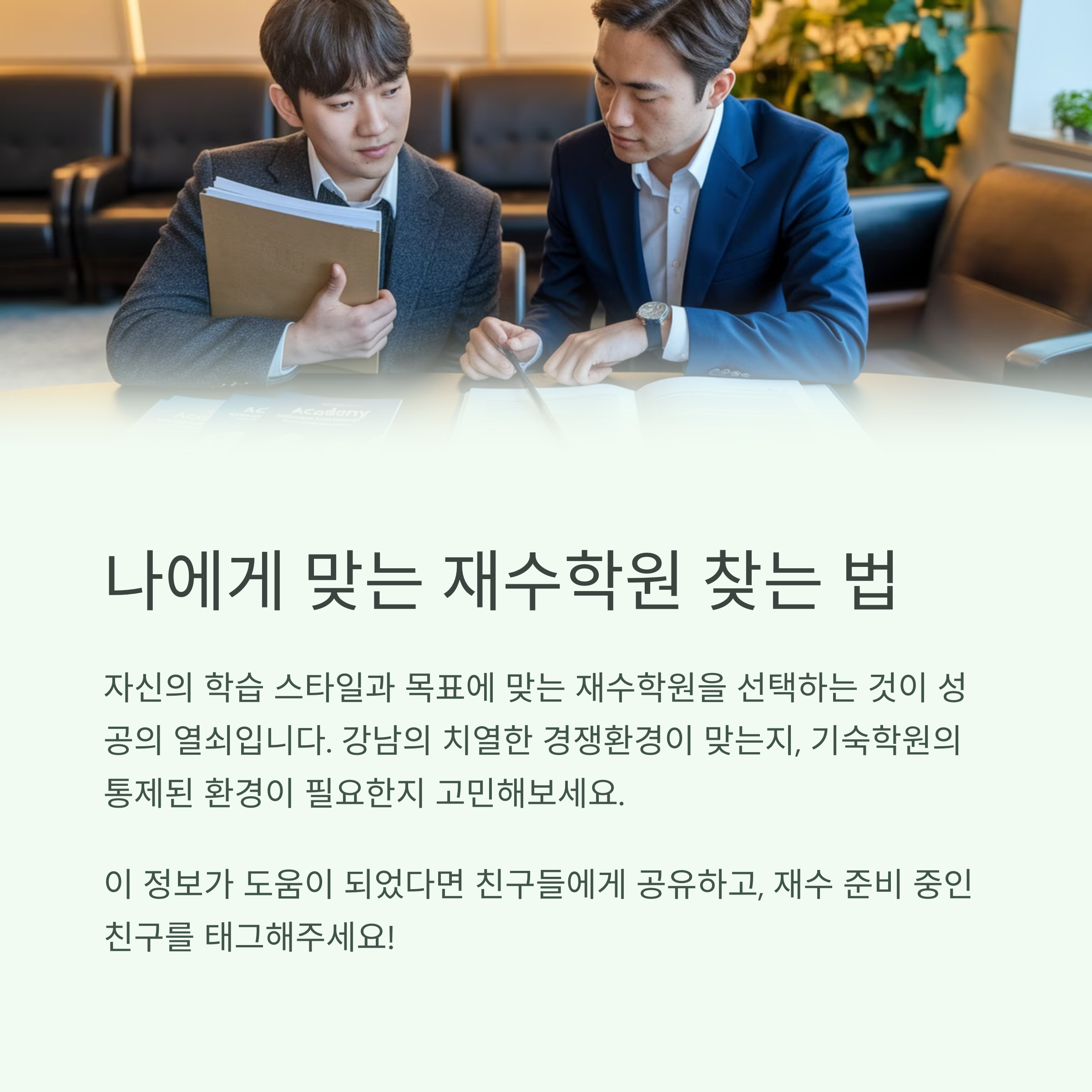 재수학원 선택에 있어 고민 중인 부분이나 직접 경험한 후기, 또는 추천하고 싶은 학원이 있다면 댓글을 통해 많은 분들과 공유해주세요. 함께 나누는 정보가 큰 힘이 됩니다.