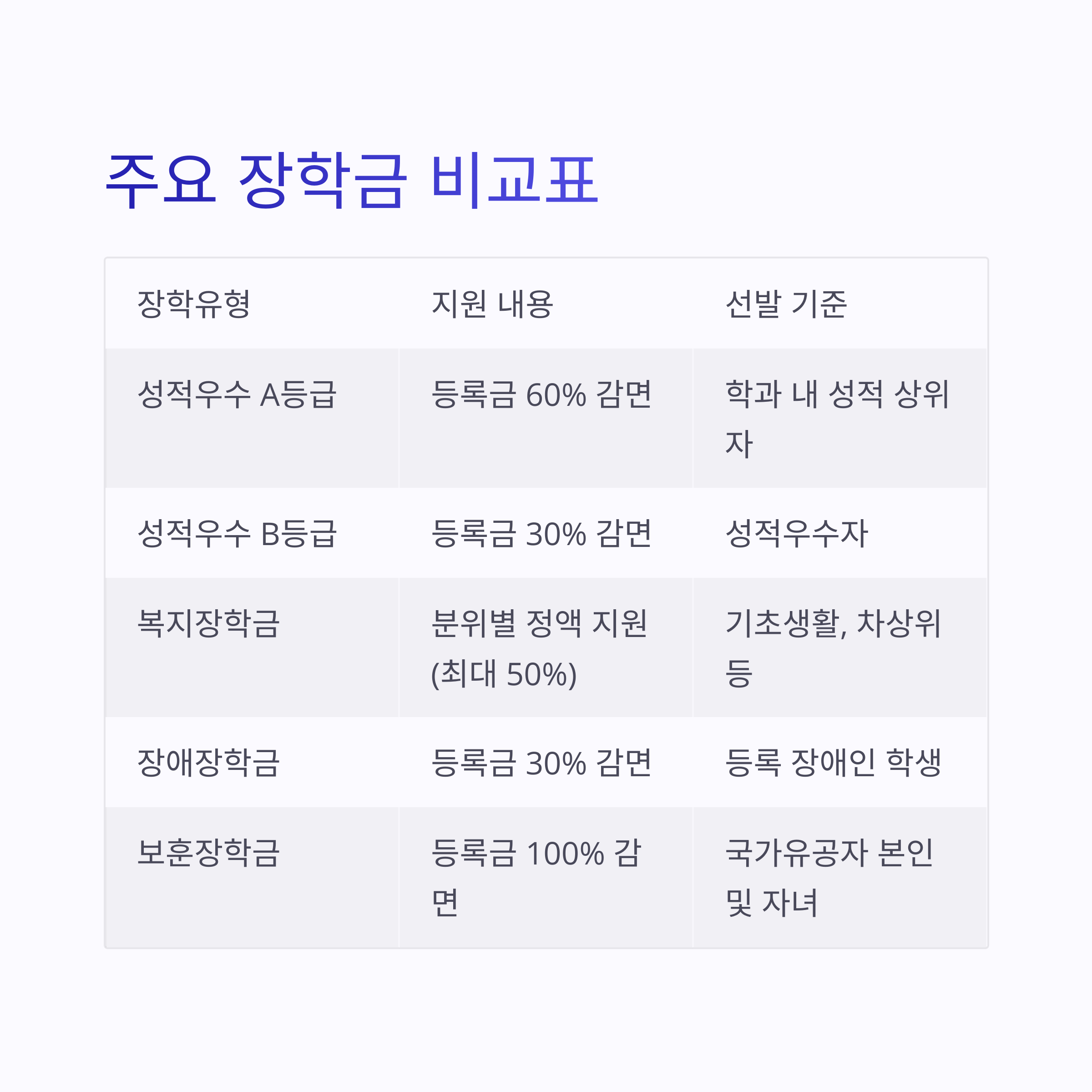 | 복지장학금 | 분위별 정액 지원 (최대 50%) | 기초생활, 차상위 등 |