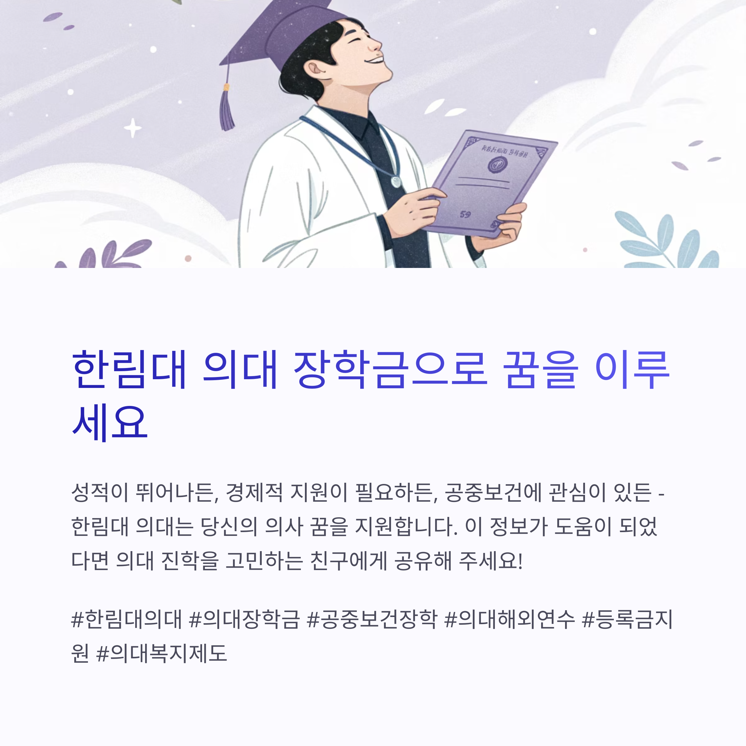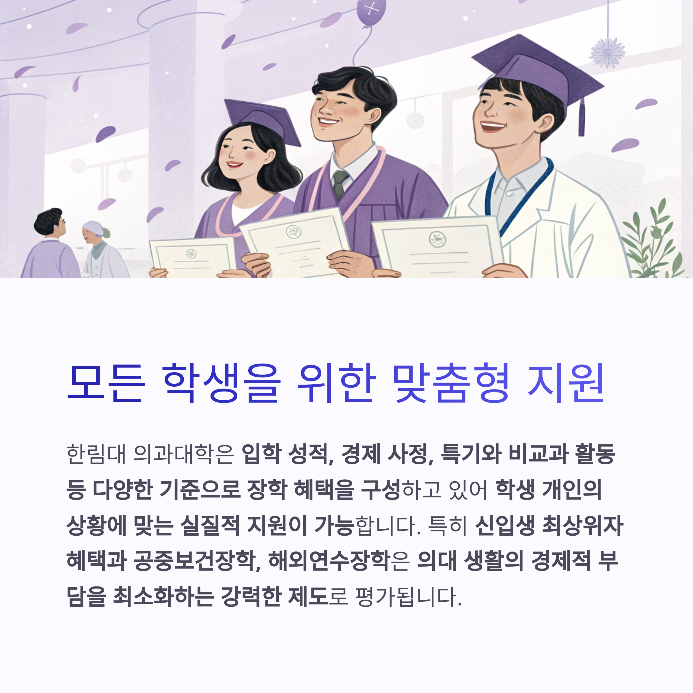 한림대학교 의과대학은 입학생부터 졸업생까지 전 주기에서 다양한 장학 혜택을 제공합니다.