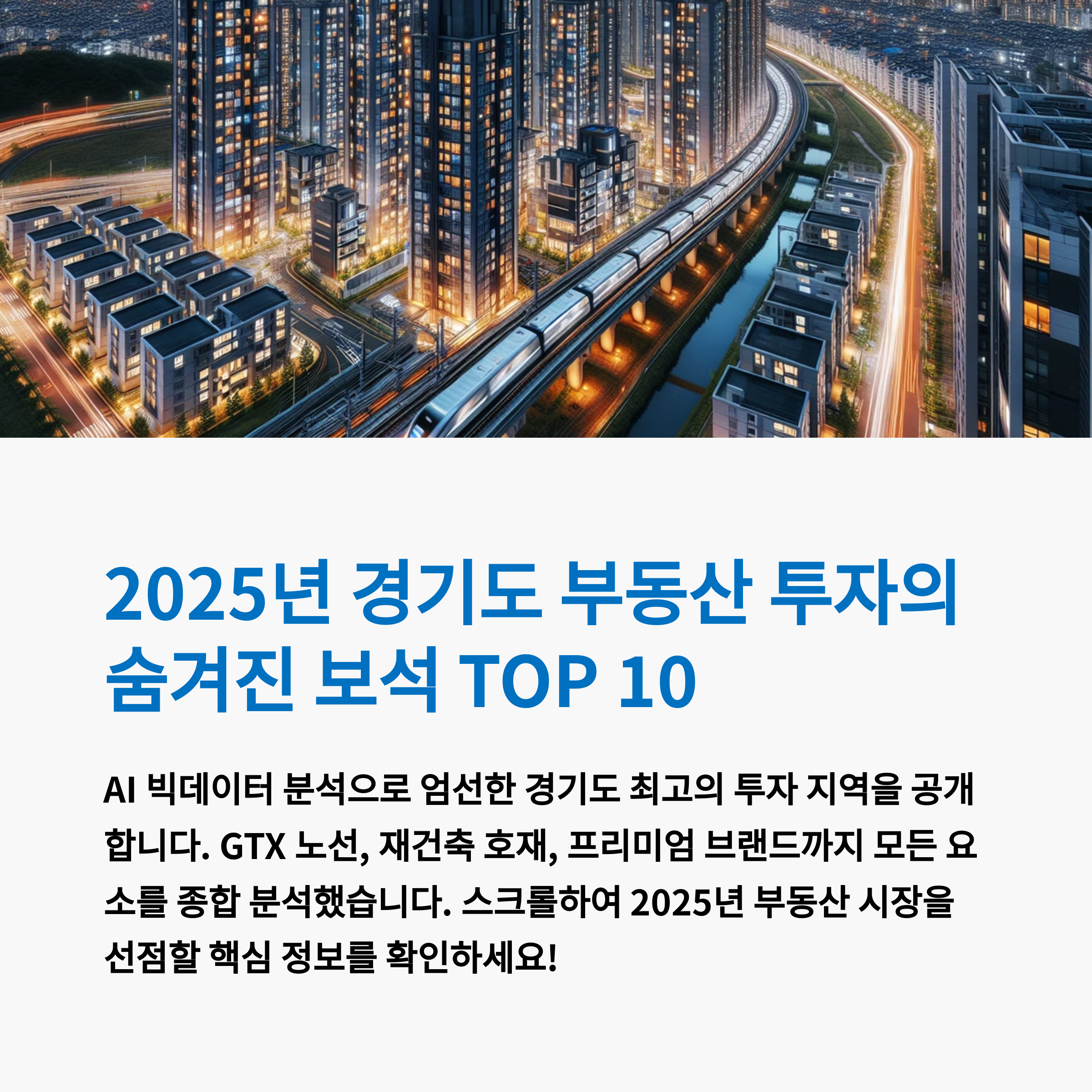 서울과 인접한 경기도는 상대적으로 합리적인 가격과 함께 지속적인 도시 개발, 교통망 확장으로 인해 부동산 투자자들의 관심이 꾸준히 높아지고 있는 지역입니다. 특히 2025년을 기점으로 수도권 GTX 노선 확장, 재건축 활성화, 대규모 주거 단지 조성 등 다양한 인프라 개선이 이루어지고 있어 중장기 가치 상승에 대한 기대감이 높습니다. 이번 콘텐츠에서는 AI 기반 입지 분석 및 최신 부동산 데이터를 바탕으로 2025년 투자 유망 아파트 단지 10곳을 엄선하였습니다. 분석 기준은 재건축 가능성, 교통 접근성, 생활 인프라, 브랜드 가치, 임대 수익률 등 다양한 요소를 종합적으로 평가한 결과이며, 실거주자뿐만 아니라 임대 투자자, 장기 수익형 투자자 모두에게 도움이 될 수 있는 정보를 제공합니다. AI가 추천한 단기, 장기, 임대 안정형 지역을 구분하여 여러 투자 목적에 따라 맞춤형 전략 수립이 가능하도록 구성하였으니 지금부터 순위별로 자세히 살펴보겠습니다.