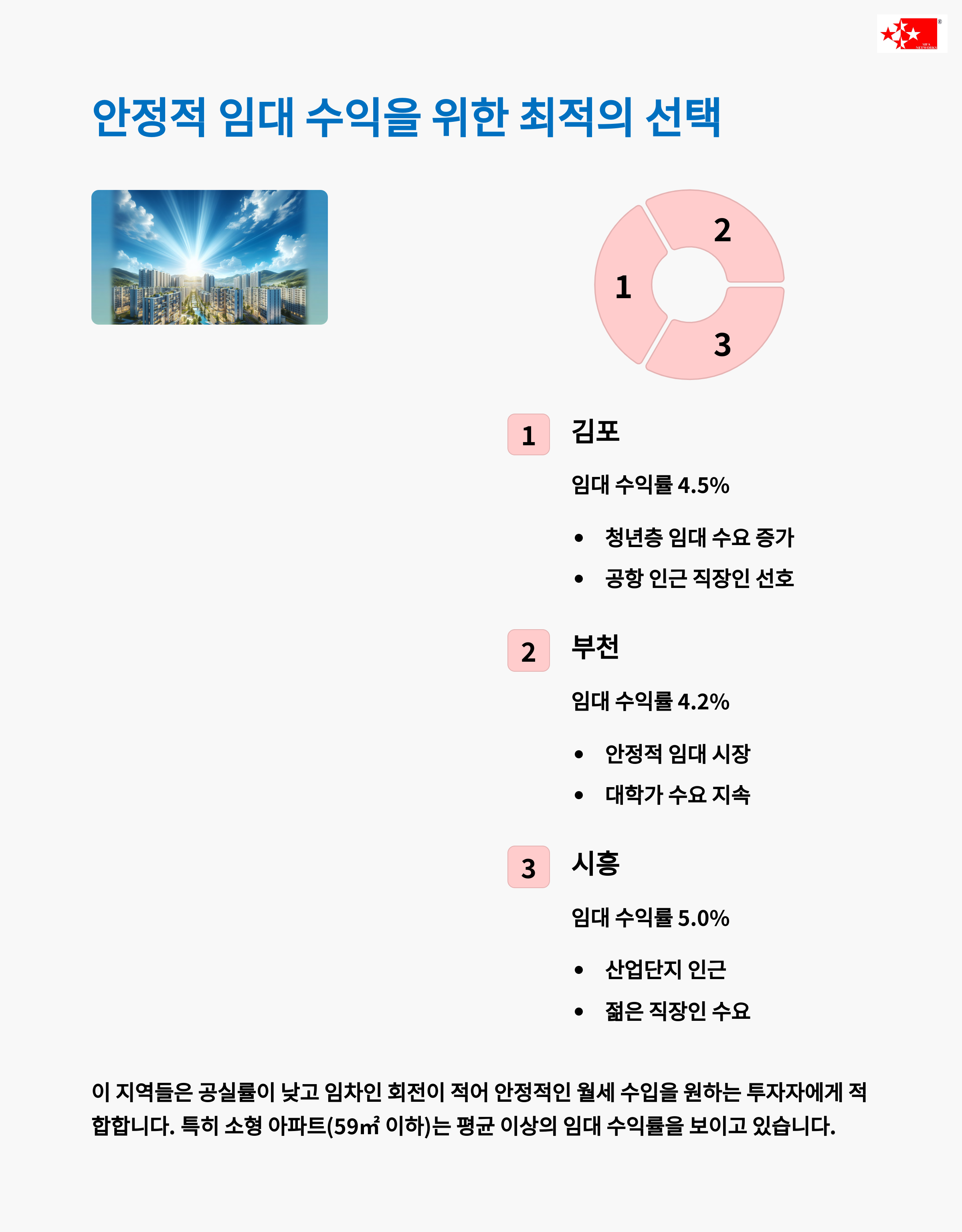김포 롯데캐슬 시그니처와 부천 e편한세상 퍼스트리움은 안정적인 임대 수익이 가능한 단지로 평가받고 있습니다. 김포골드라인 접근성과 인구 유입이 꾸준한 김포는 중소형 투자자에게 매력적인 지역이며, 부천은 서울과의 접근성과 대규모 커뮤니티 시설로 실거주 및 임대 수요를 동시에 흡수할 수 있는 장점이 있습니다. 이 외에도 광교신도시, 미사강변도시, 의정부 민락2지구는 친환경 요소와 대규모 기반시설을 갖춘 지역으로 중장기 관점에서 자산 가치를 높이고자 하는 투자자에게 좋은 기회를 제공할 것입니다.