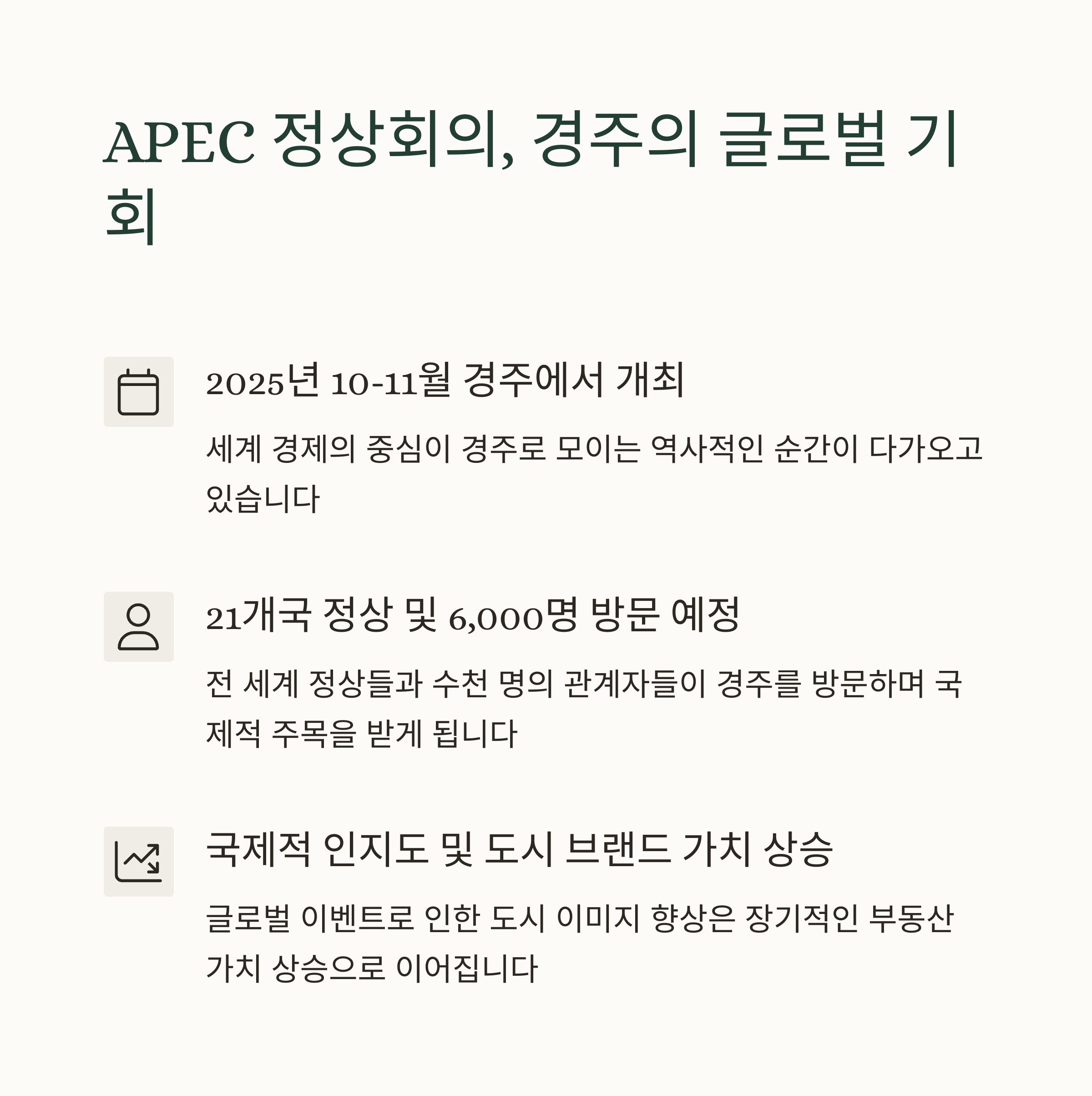 여기에 더해 2025년 APEC 정상회의 개최가 경주의 관광산업에 새로운 전환점을 가져올 예정입니다. 신라왕경 복원 사업, 디지털 미디어 아트 콘텐츠, 세계유산 탐방기지 조성 등 다양한 관광 프로젝트가 연계되며 보문관광단지와 중심상권은 특수 수요의 중심이 됩니다. 숙박시설, 상업용 건물, 카페·레스토랑 등 관광 소비 관련 부동산의 가치가 단기적으로 급등할 가능성이 있으며, 중소형 상가 투자 수요도 크게 늘어날 전망입니다.
