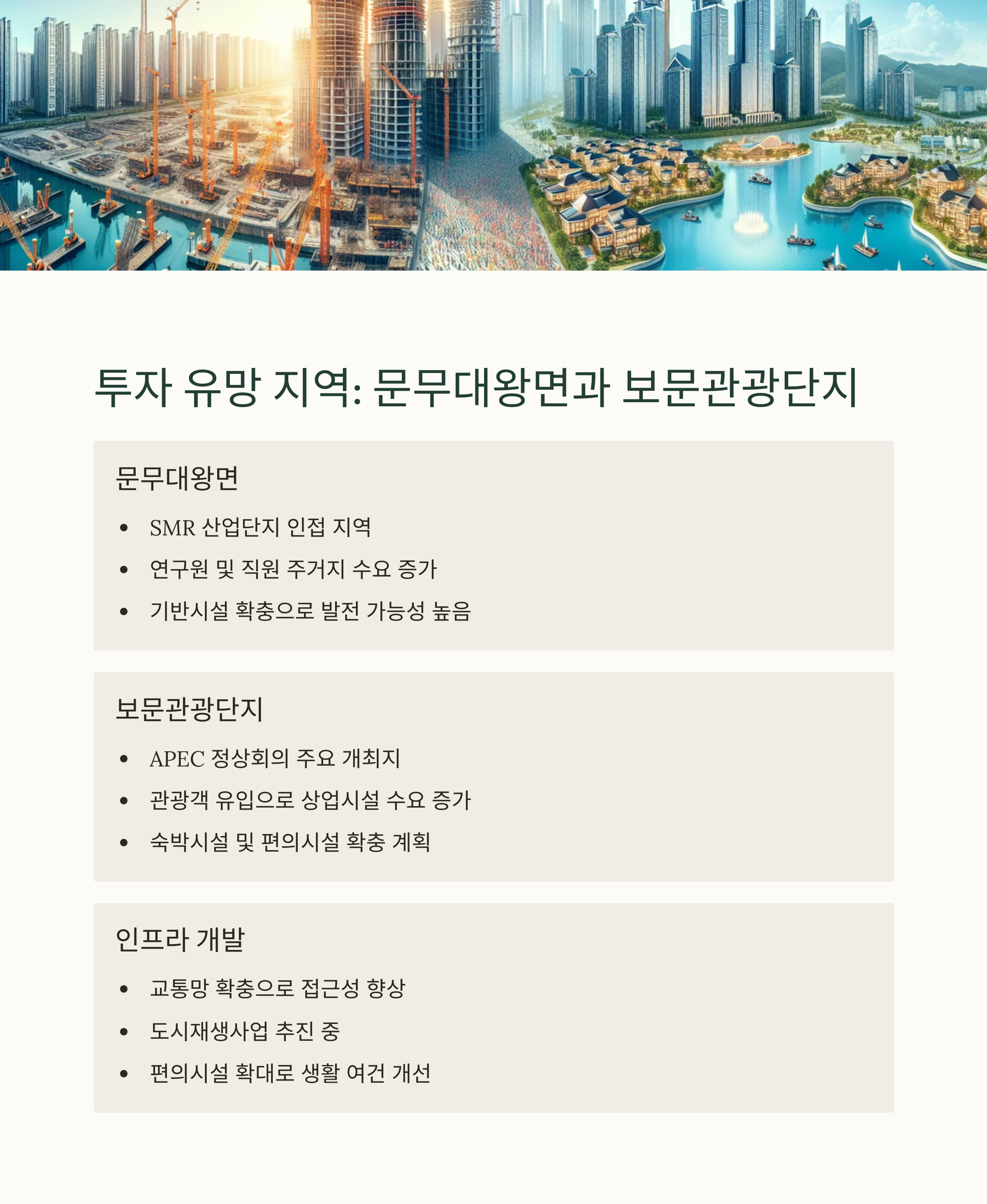 2025년 경주는 산업과 관광이라는 두 축을 기반으로 부동산 시장의 안정성과 성장성을 동시에 확보할 수 있는 드문 지역입니다. SMR 국가산단과 APEC 개최는 단순한 이벤트를 넘어 경주 전역에 걸친 도시 재편과 수요 재배치를 유발하고 있으며, 이는 투자자들에게 확실한 기회를 제공하고 있습니다. 문무대왕면과 보문관광단지를 중심으로 장기적인 시야로 접근한다면 안정적이면서도 수익성 있는 부동산 전략이 가능할 것입니다.