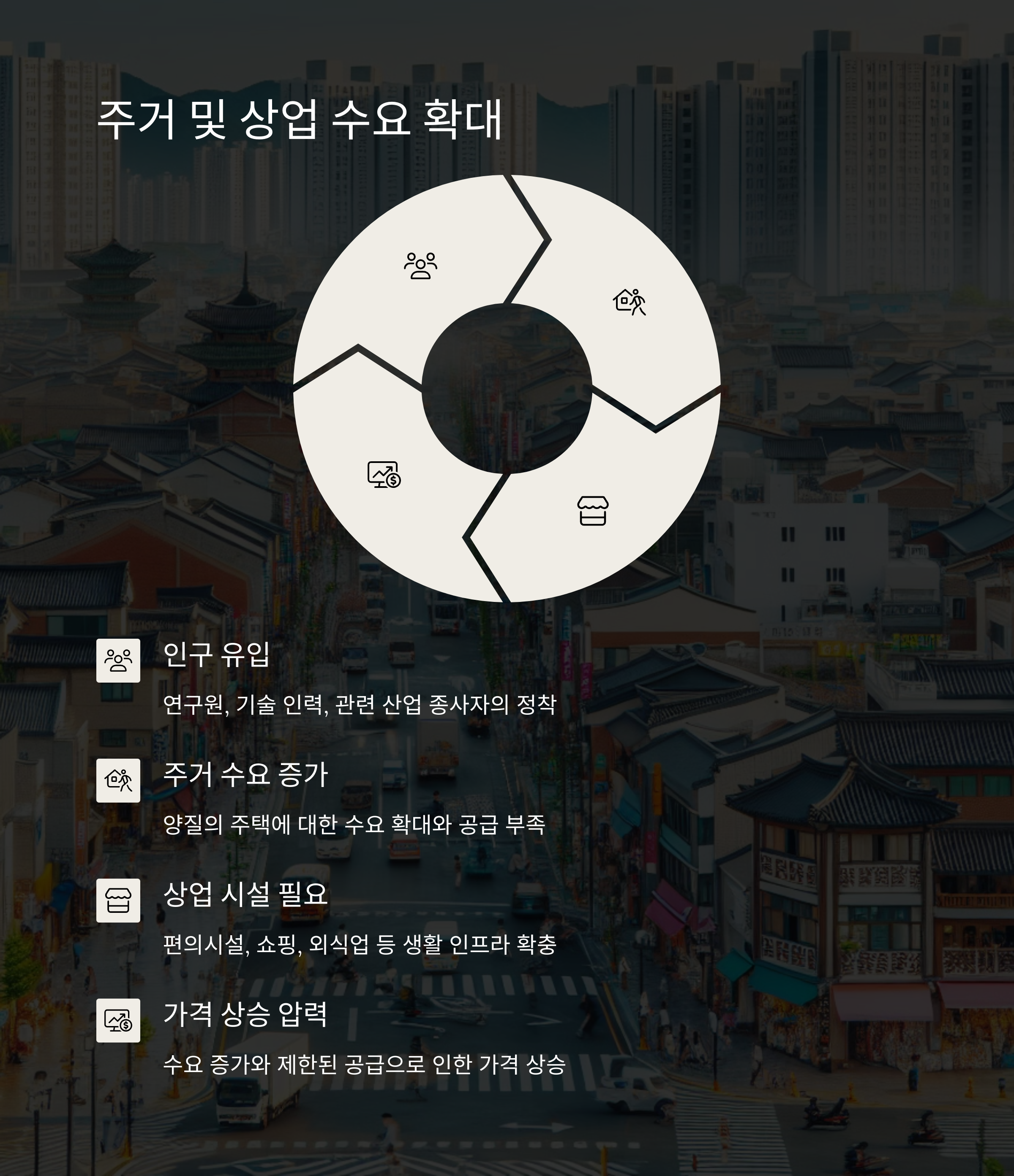고급 기술 인력과 관련 종사자들의 유입이 예상되어 주거 수요가 급증할 것으로 보입니다. 산업단지 인근 지역은 장기적인 가치 상승이 유력합니다.