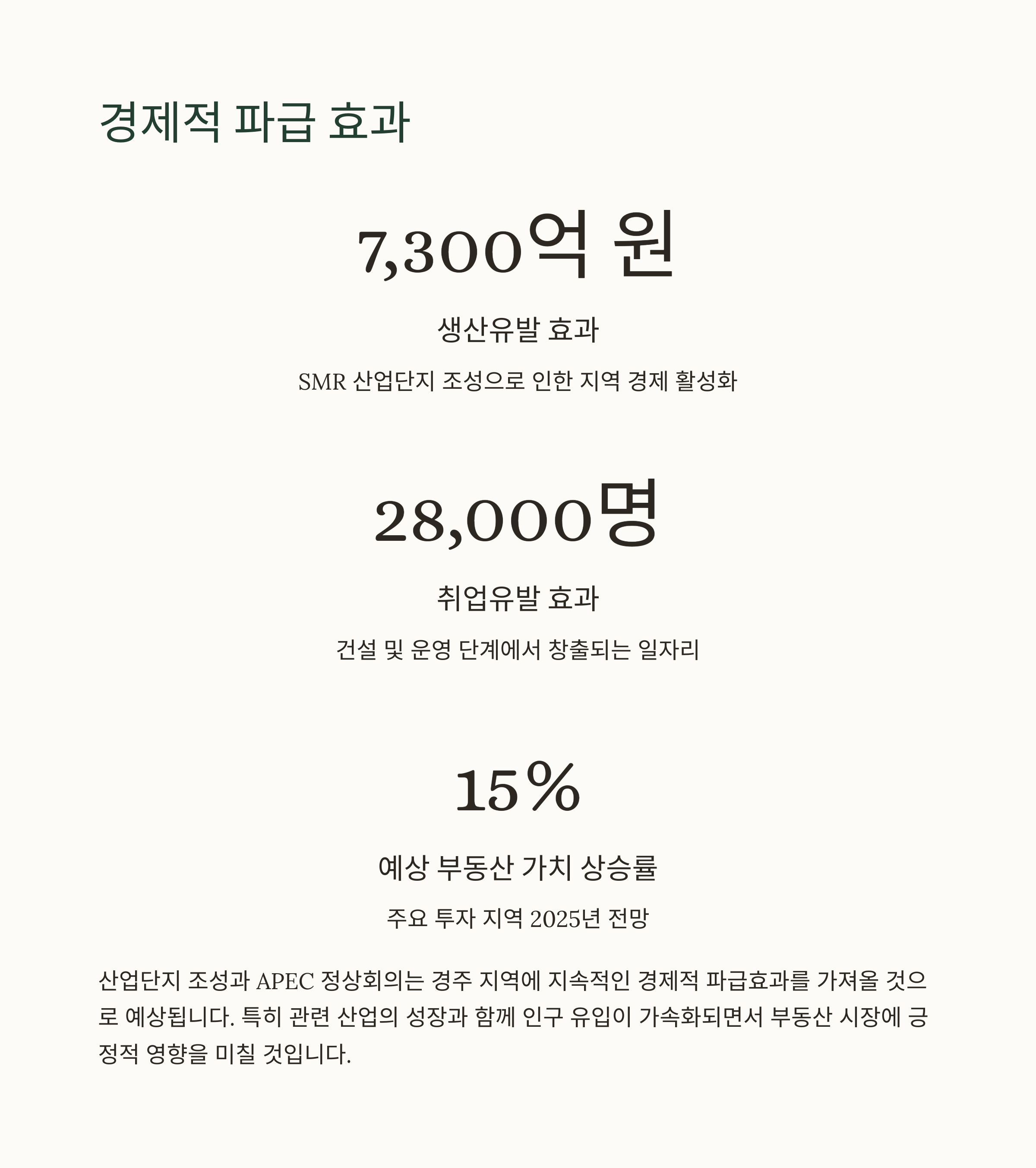 경주는 2025년을 기점으로 대한민국 에너지 산업의 허브로 도약할 준비를 마쳤습니다. 정부는 경주를 SMR(소형 모듈 원자로) 산업단지의 거점으로 지정하고, 2030년까지 약 7.8조 원을 투입해 ‘경주 SMR 국가산단’을 조성 중입니다. 해당 단지에는 설계, 생산, 수출이 통합된 글로벌 수준의 에너지 생태계가 구축되며, 약 2만 8천여 명의 고급 기술 인력이 경주에 정착할 것으로 예측됩니다. 이로 인해 문무대왕면을 중심으로 한 주거 및 상업 시설 수요가 폭발적으로 증가할 가능성이 높으며, 중장기적 부동산 가치 상승이 기대됩니다.