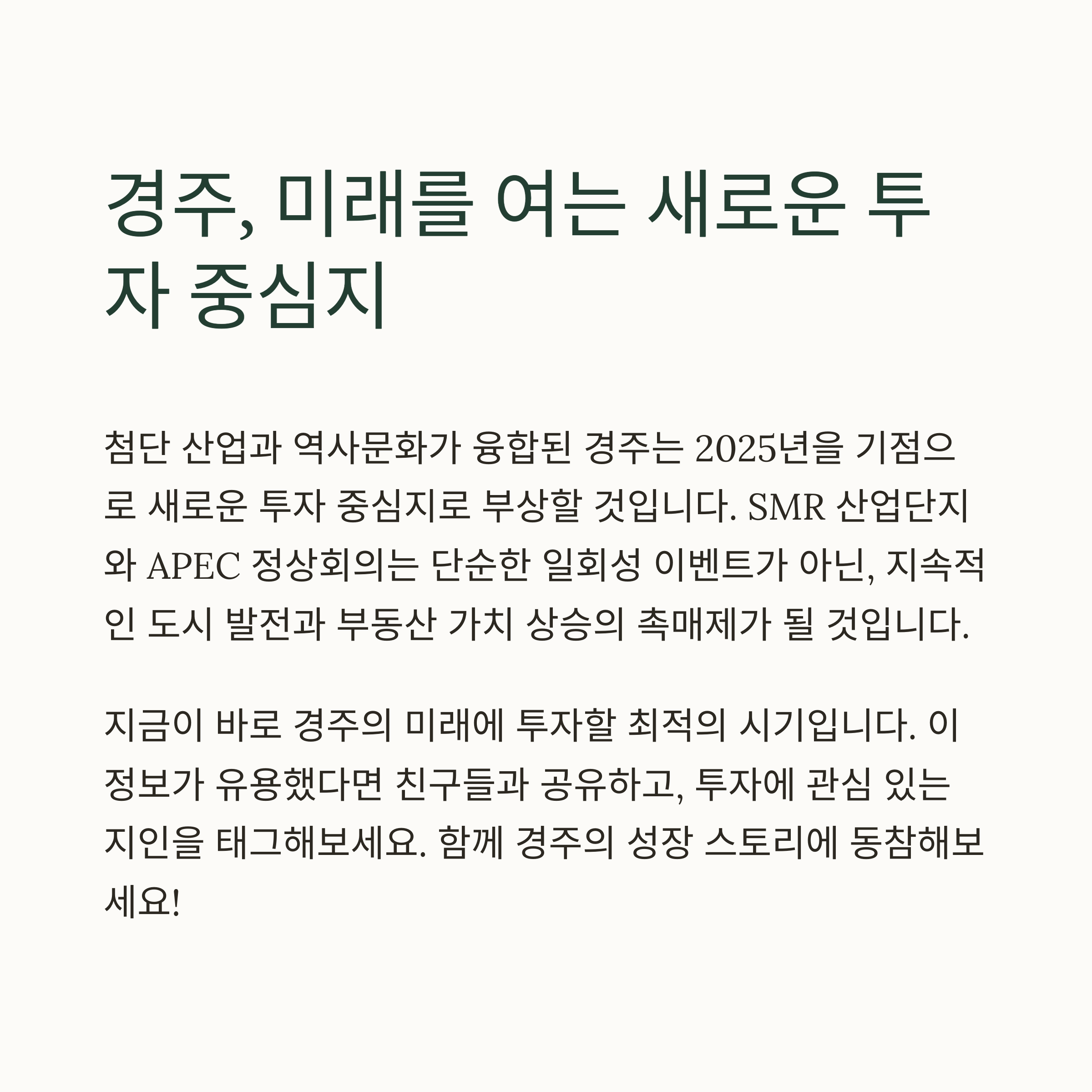 2025년 경주는 산업과 관광이라는 두 축을 기반으로 부동산 시장의 안정성과 성장성을 동시에 확보할 수 있는 드문 지역입니다. SMR 국가산단과 APEC 개최는 단순한 이벤트를 넘어 경주 전역에 걸친 도시 재편과 수요 재배치를 유발하고 있으며, 이는 투자자들에게 확실한 기회를 제공하고 있습니다. 문무대왕면과 보문관광단지를 중심으로 장기적인 시야로 접근한다면 안정적이면서도 수익성 있는 부동산 전략이 가능할 것입니다.