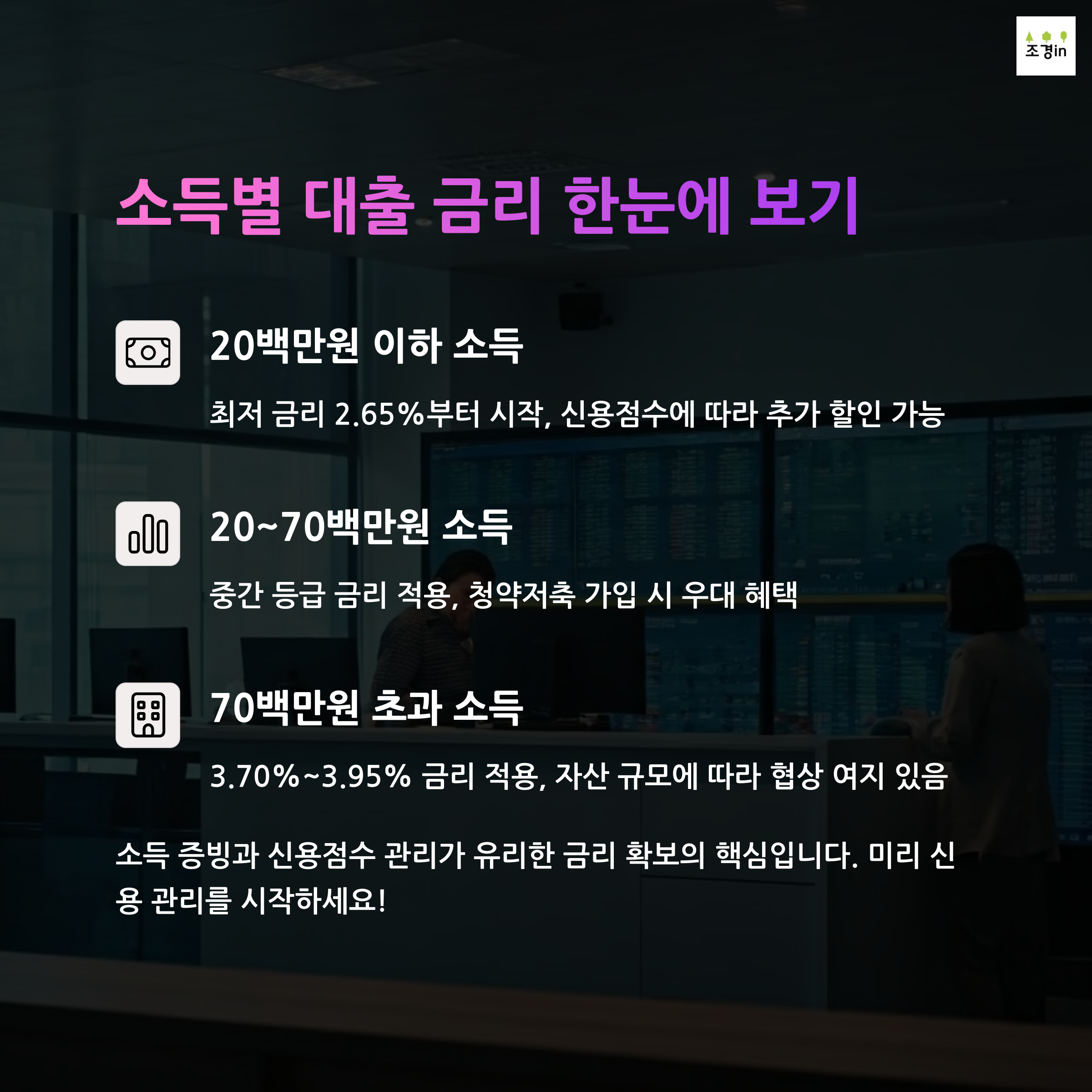 반대로, 고소득자인 70백만원 초과 소득층은 약 3.70% ~ 3.95%의 높은 금리가 적용됩니다.