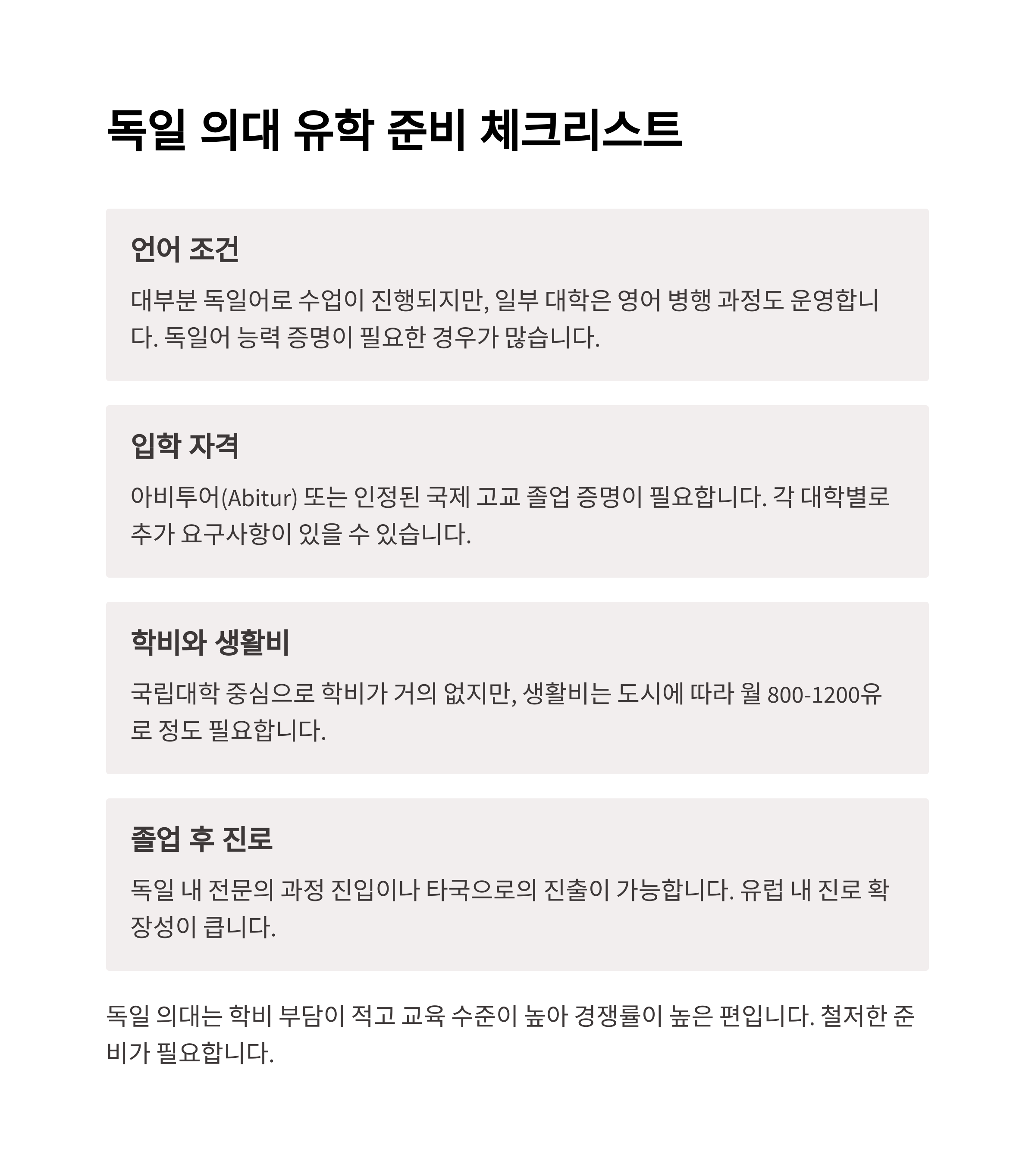 독일 의대는 학비가 거의 없고, 졸업 후 유럽 내 진로 확장성도 크다는 점에서 경쟁력이 높습니다.