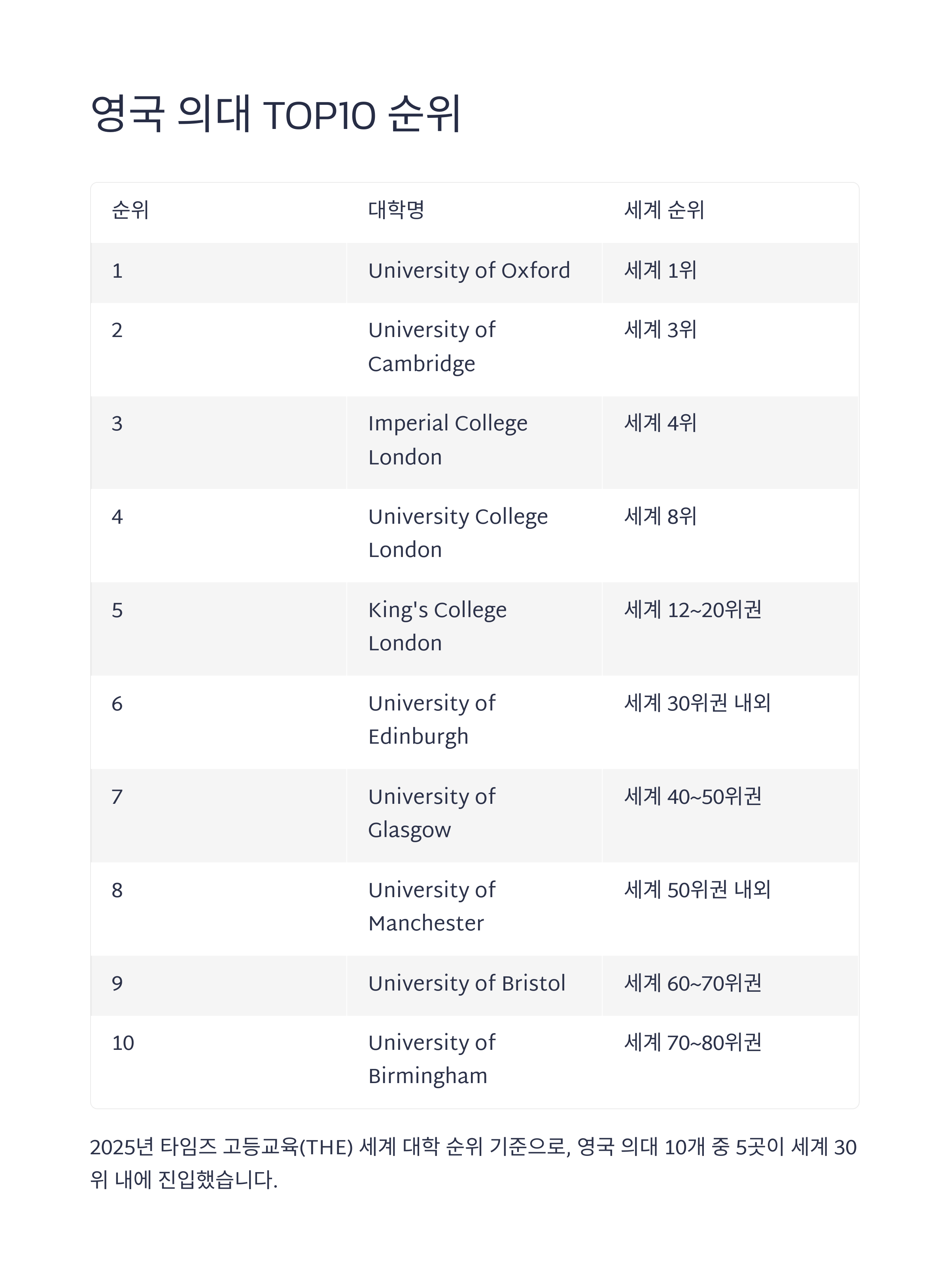 → 2025년, 영국 10개 의대 중 5곳이 세계 30위 내 진입