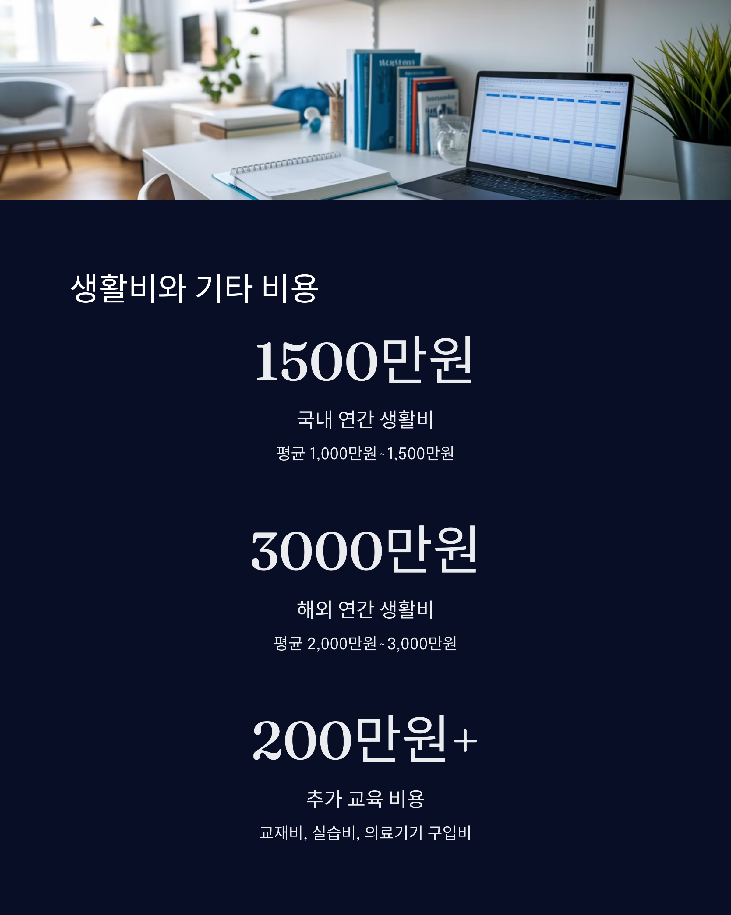 의대 학비뿐만 아니라 생활비도 중요한 요소입니다. 국내 대학의 경우, 서울과 지방의 생활비 차이가 크며, 기숙사 이용 여부에 따라 지출이 달라집니다. 해외 의대의 경우, 물가와 환율 차이로 인해 예상보다 높은 생활비가 들 수 있습니다. 특히, 미국이나 영국 같은 고물가 국가에서는 한 달 생활비가 2,000달러를 넘는 경우도 흔합니다.