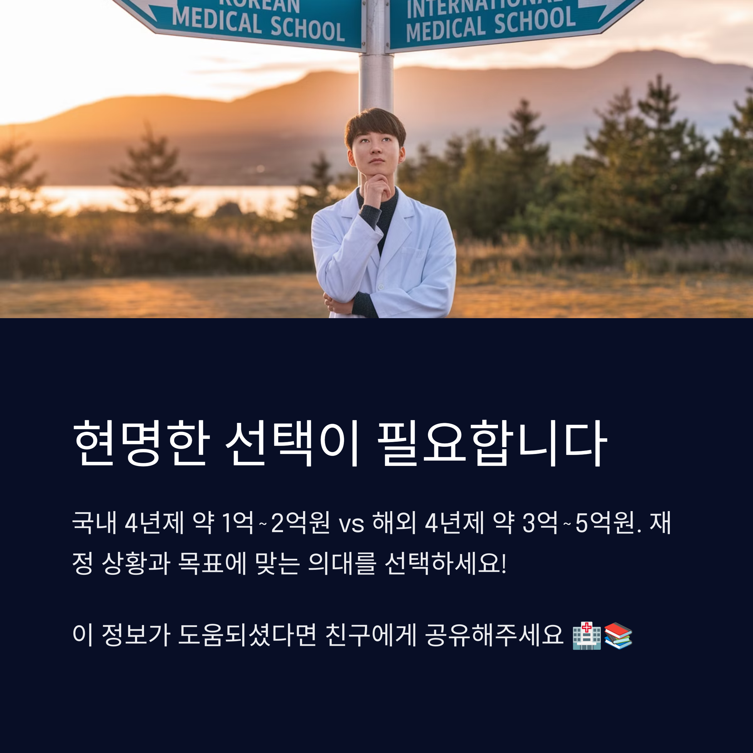 국내와 해외 의대 중 어떤 선택이 더 나을까요? 비용뿐만 아니라 졸업 후 진로, 언어 문제, 생활 환경 등 다양한 요소를 고려해야 합니다.