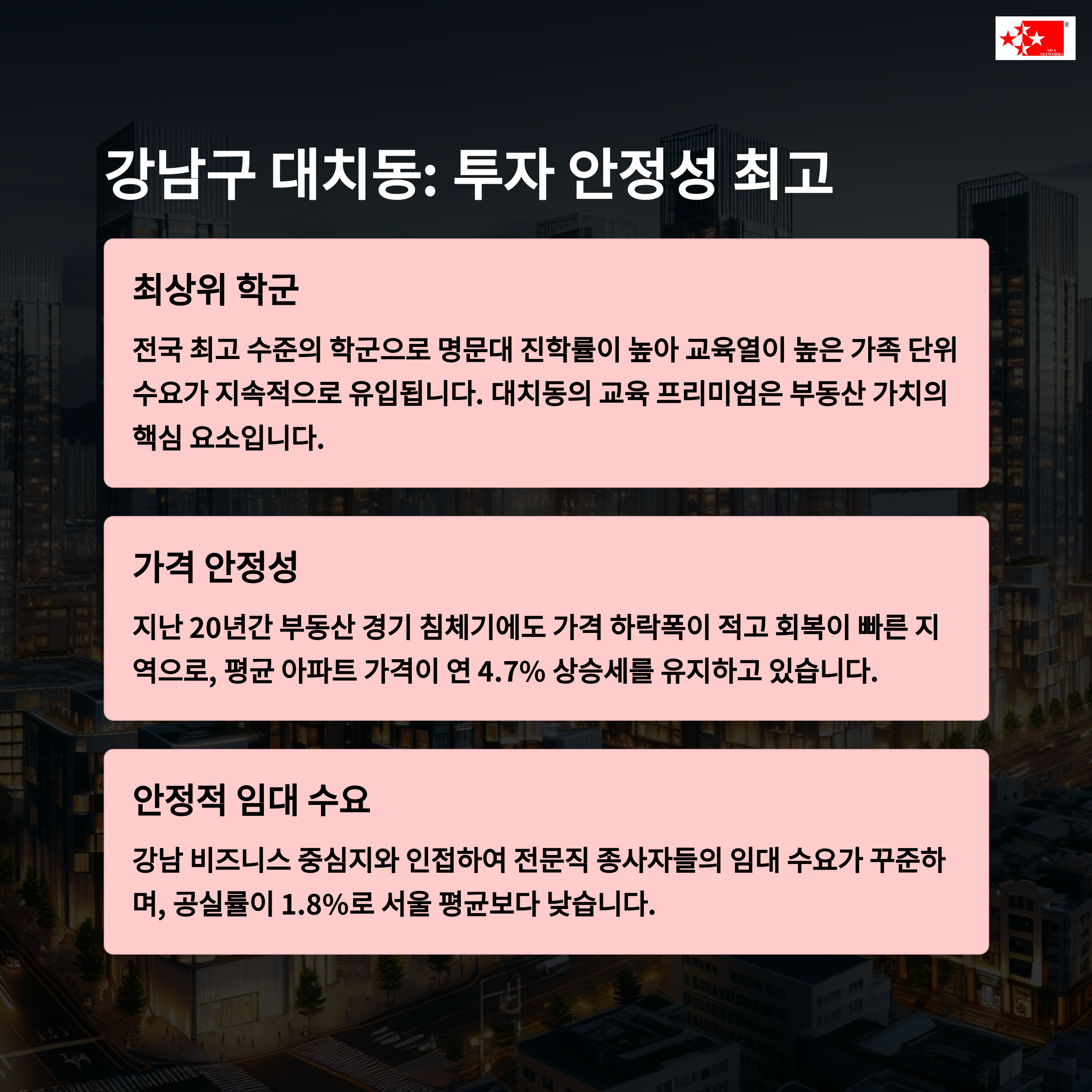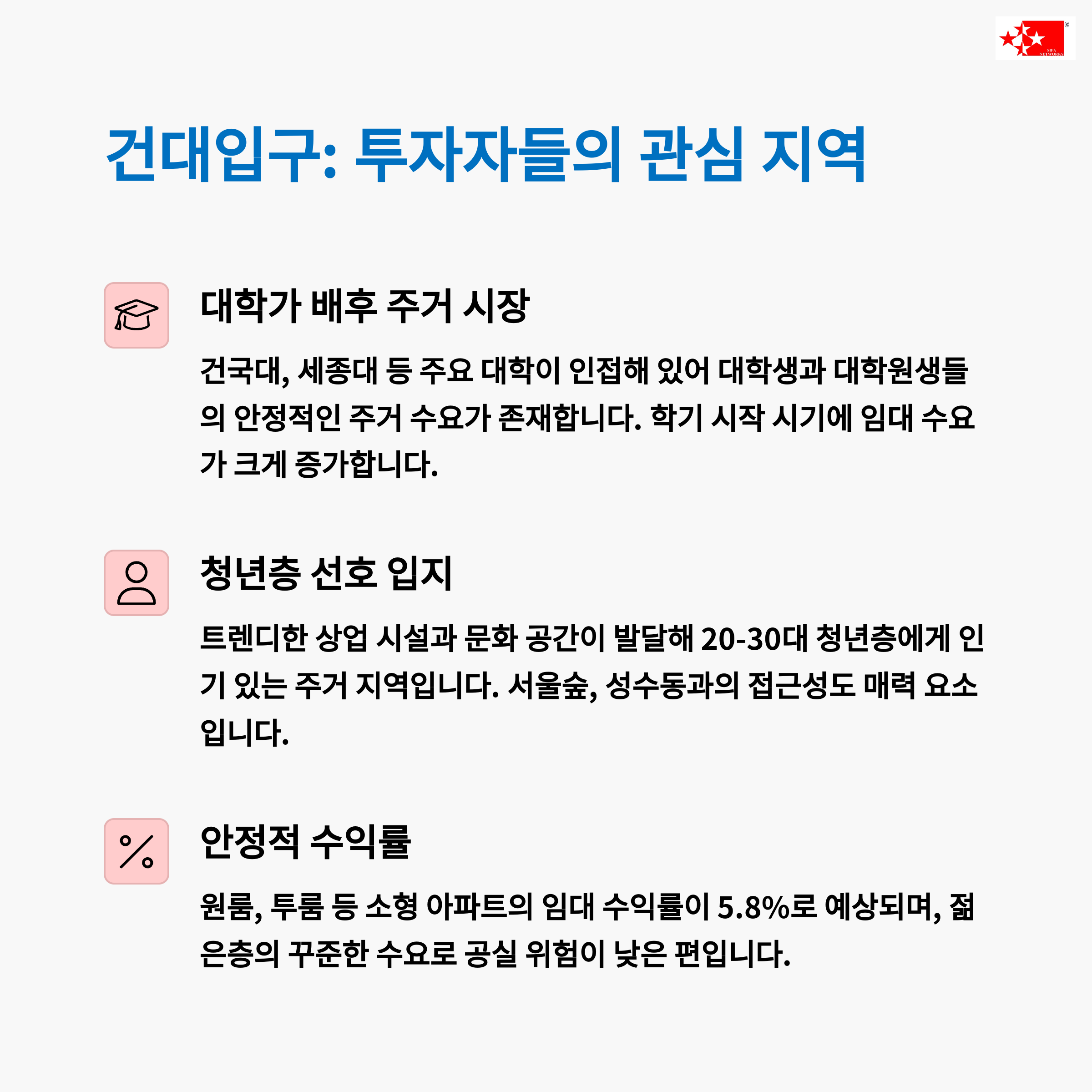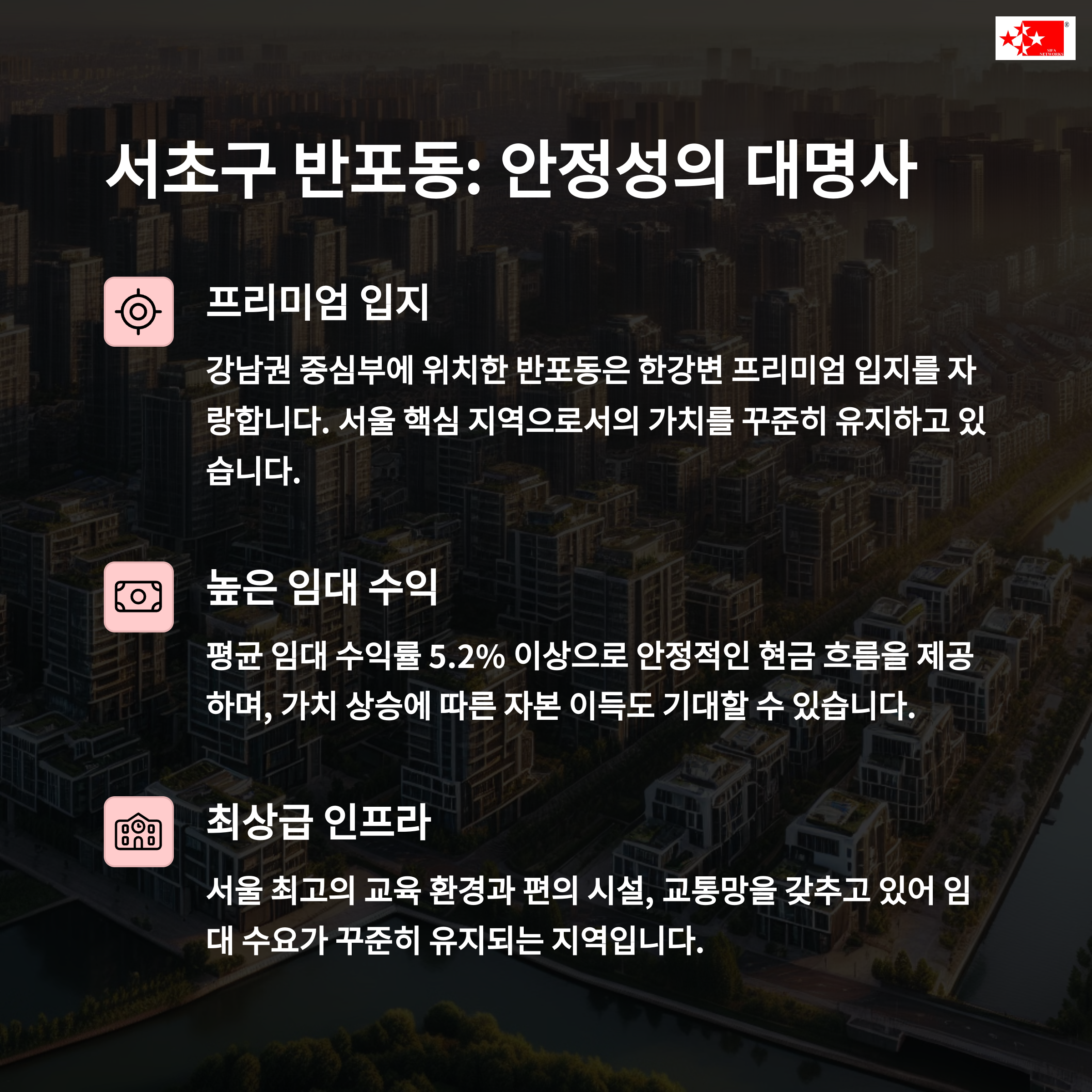 용산 한남동, 판교 테크노밸리, 성수동 등 | 평균 3.5~4.5% 수준의 안정적 수익률 | 장기적 가치 상승 기대되는 입지 중심 |