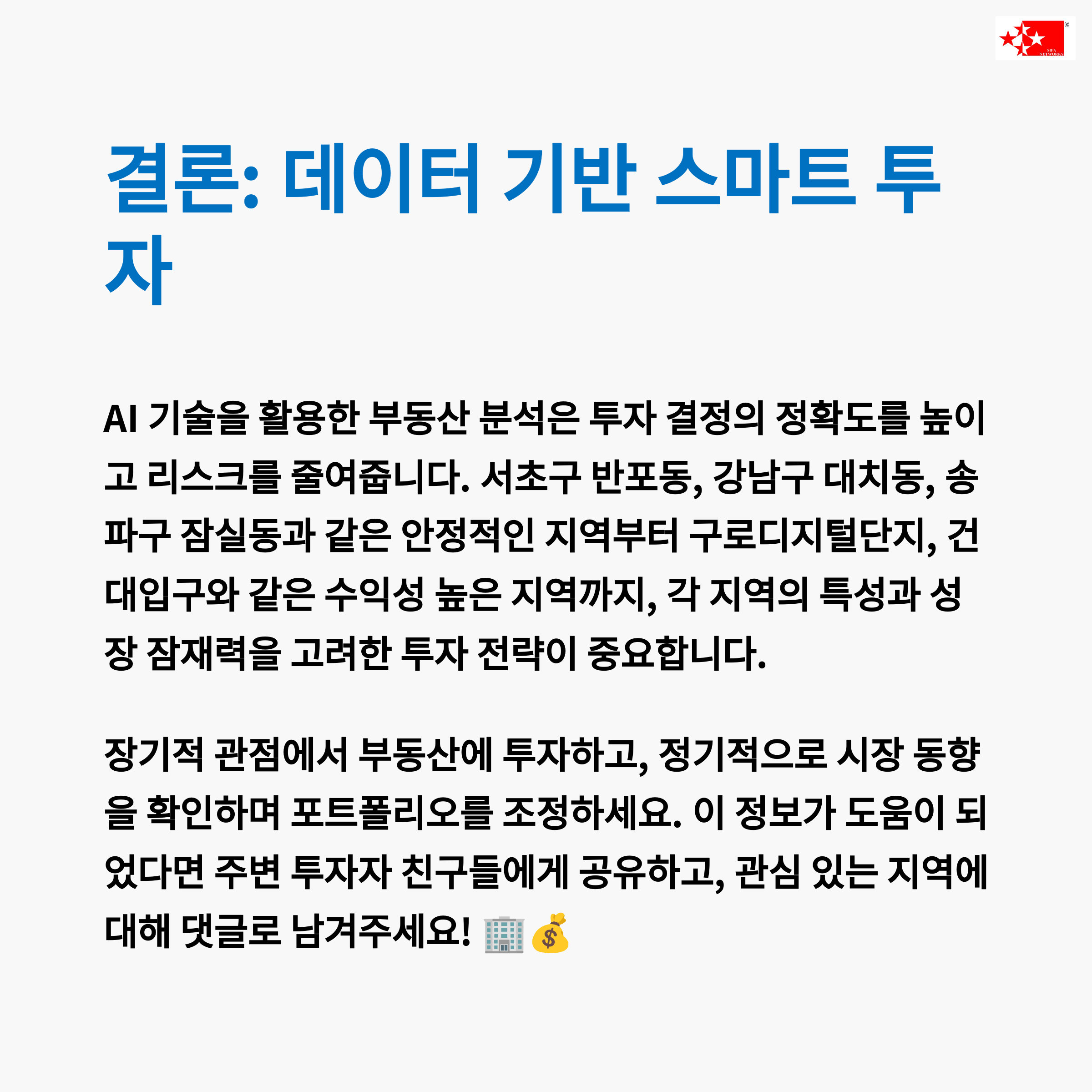부동산 투자의 핵심은 정보의 정확성과 타이밍입니다. AI 기술을 접목한 입지 분석은 기존 감에 의존하던 투자의 한계를 넘어서 명확한 수치와 근거 기반의 판단을 가능하게 해줍니다. 이번에 소개한 10곳은 단순히 인기 지역이 아닌, 임대 수익률과 미래 개발 가능성, 교통망 변화까지 종합적으로 고려한 결과로 2025년을 기준으로 가장 유망한 투자처라 평가됩니다. 단기 수익을 원한다면 구로, 광진을, 장기적 가치 상승을 원한다면 강남, 반포, 고덕 등을 고려해보세요. AI가 추천한 입지는 시장의 흐름보다 한 발 앞선 미래를 준비하는 전략적 도구가 되어줄 것입니다.