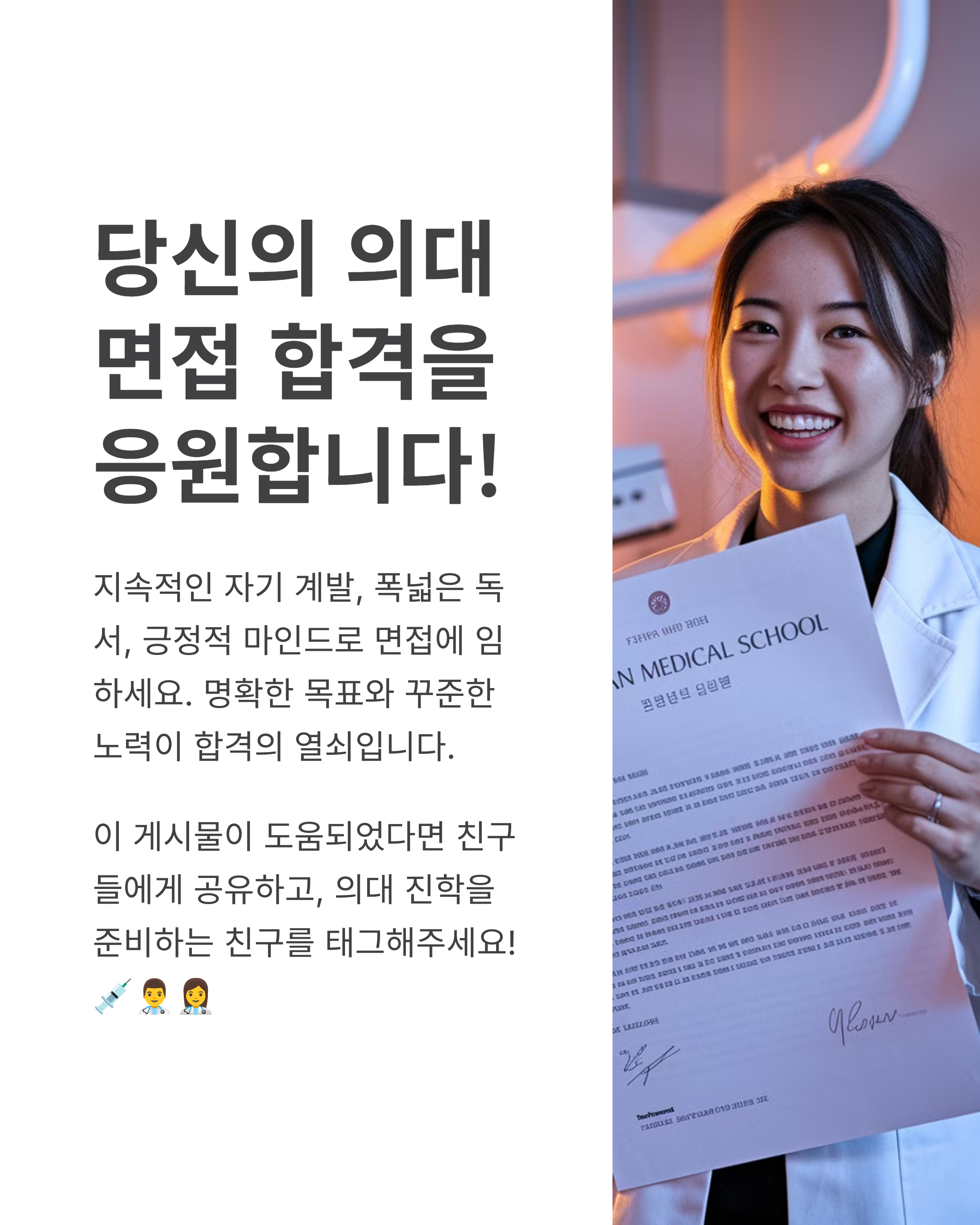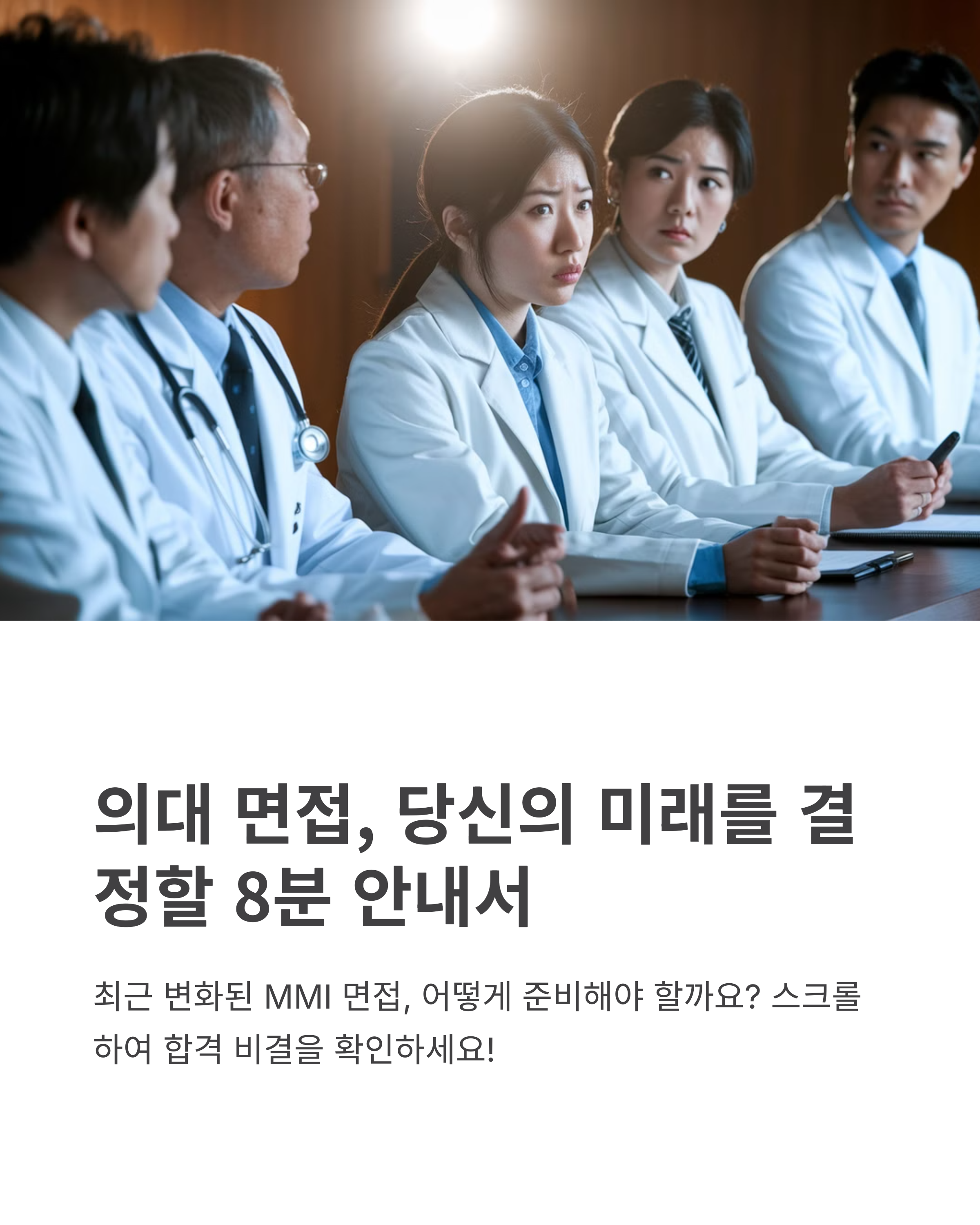 의대 면접은 단순 암기가 아닌 의료인의 태도, 판단력, 인성을 종합 평가하는 전형입니다. 특히 MMI 확대와 시사 기반 질문 증가로 인해 체계적 사고 프레임과 반복 연습이 필수입니다. 하루 15분씩 모의 질문에 답해보고, 자신의 말하기 구조와 가치관 일관성을 점검하세요. 실제 합격자 78%가 6개월 이상 면접 훈련을 지속했다는 데이터를 기억하세요.