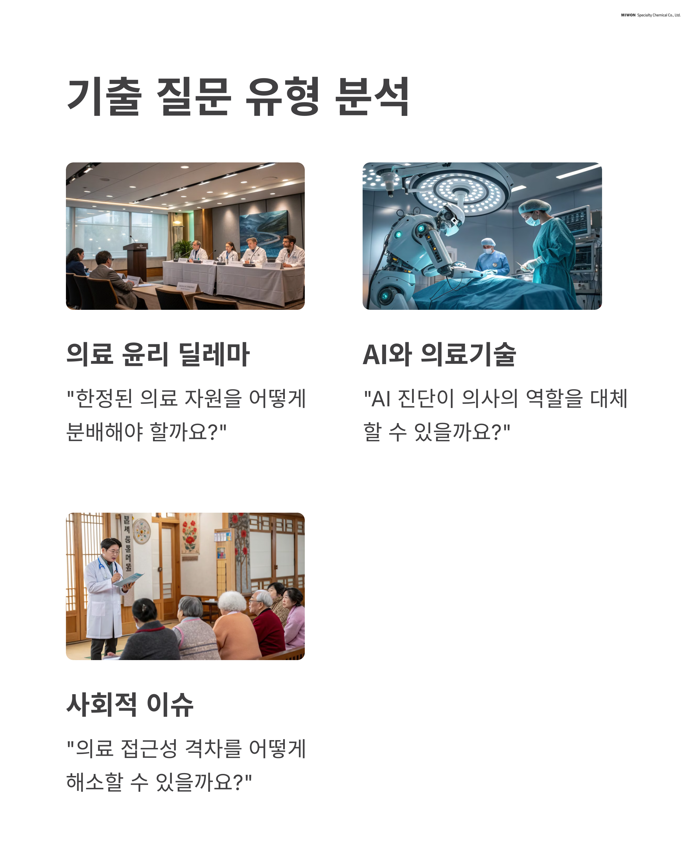 | 논리성, 공감능력, 전문성 | 의료윤리, 상황 판단, 연구 역량 | 4단계 프레임: 정의 → 분석 → 근거 → 대안 |