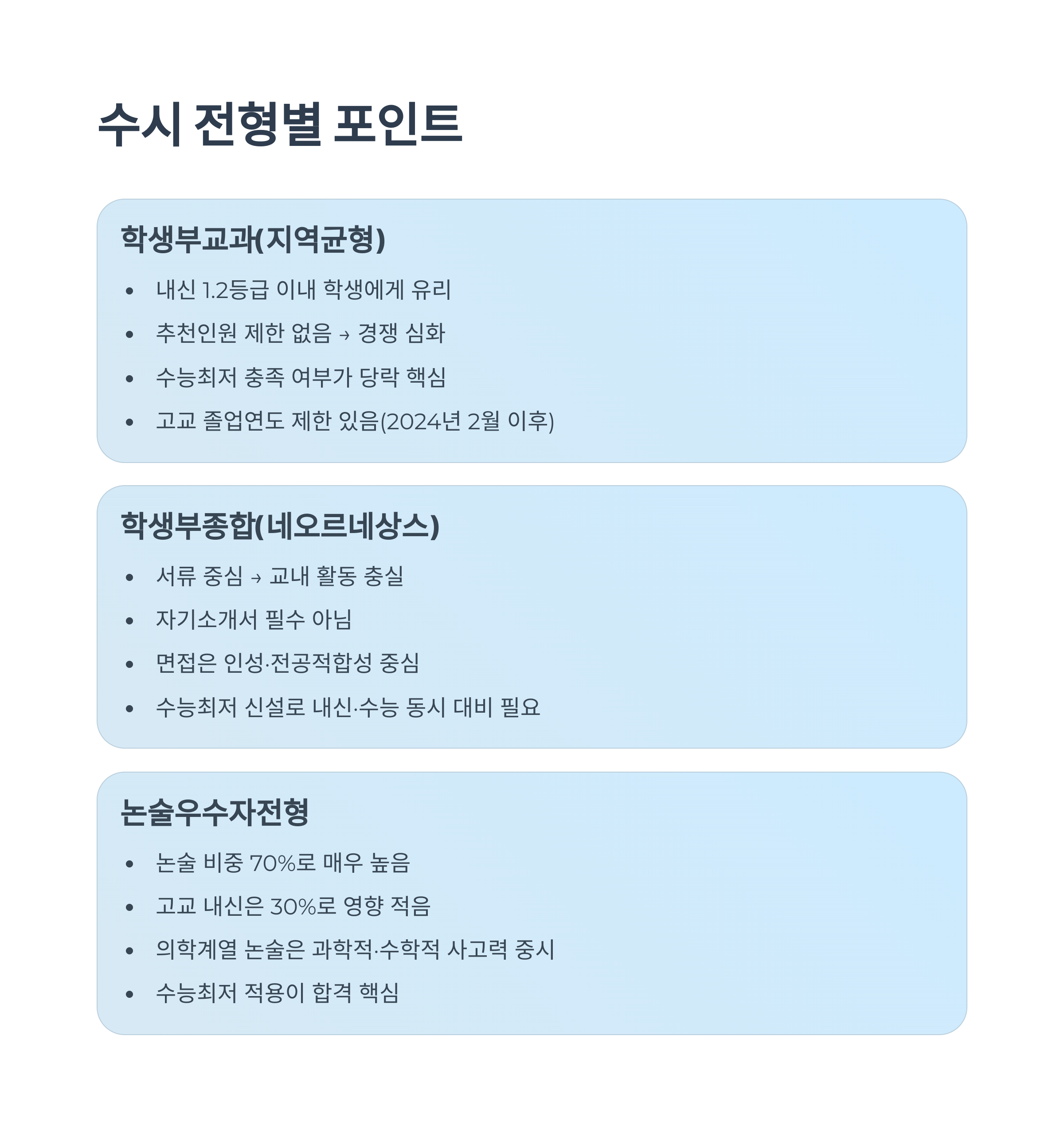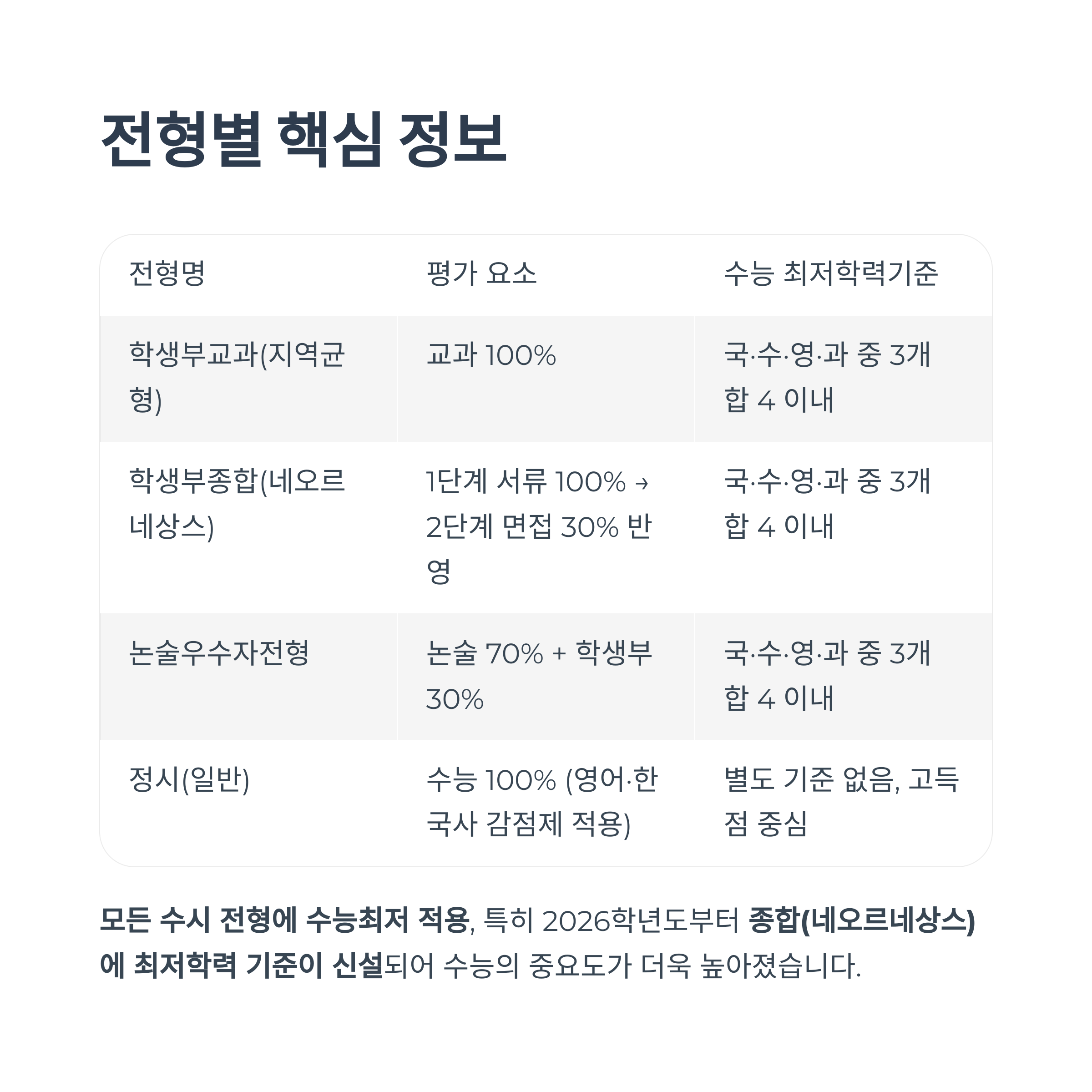 모든 수시 전형에 수능최저 적용, 특히 2026학년도부터 종합(네오르네상스)에 최저학력 기준이 신설되어 수능의 중요도가 더욱 높아졌습니다.