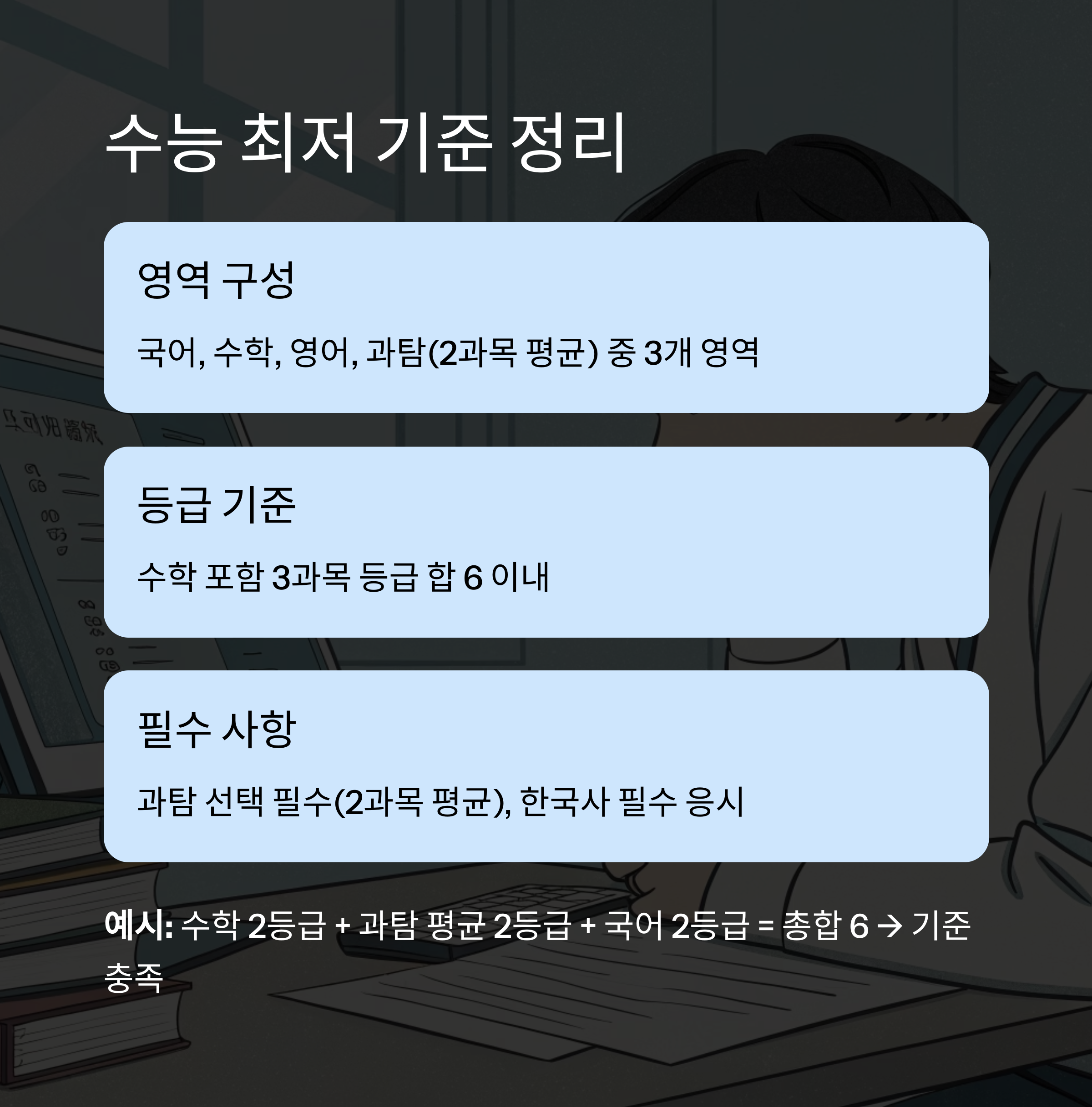 예시: 수학 2등급 + 과탐 평균 2등급 + 국어 2등급 = 총합 6 → 기준 충족